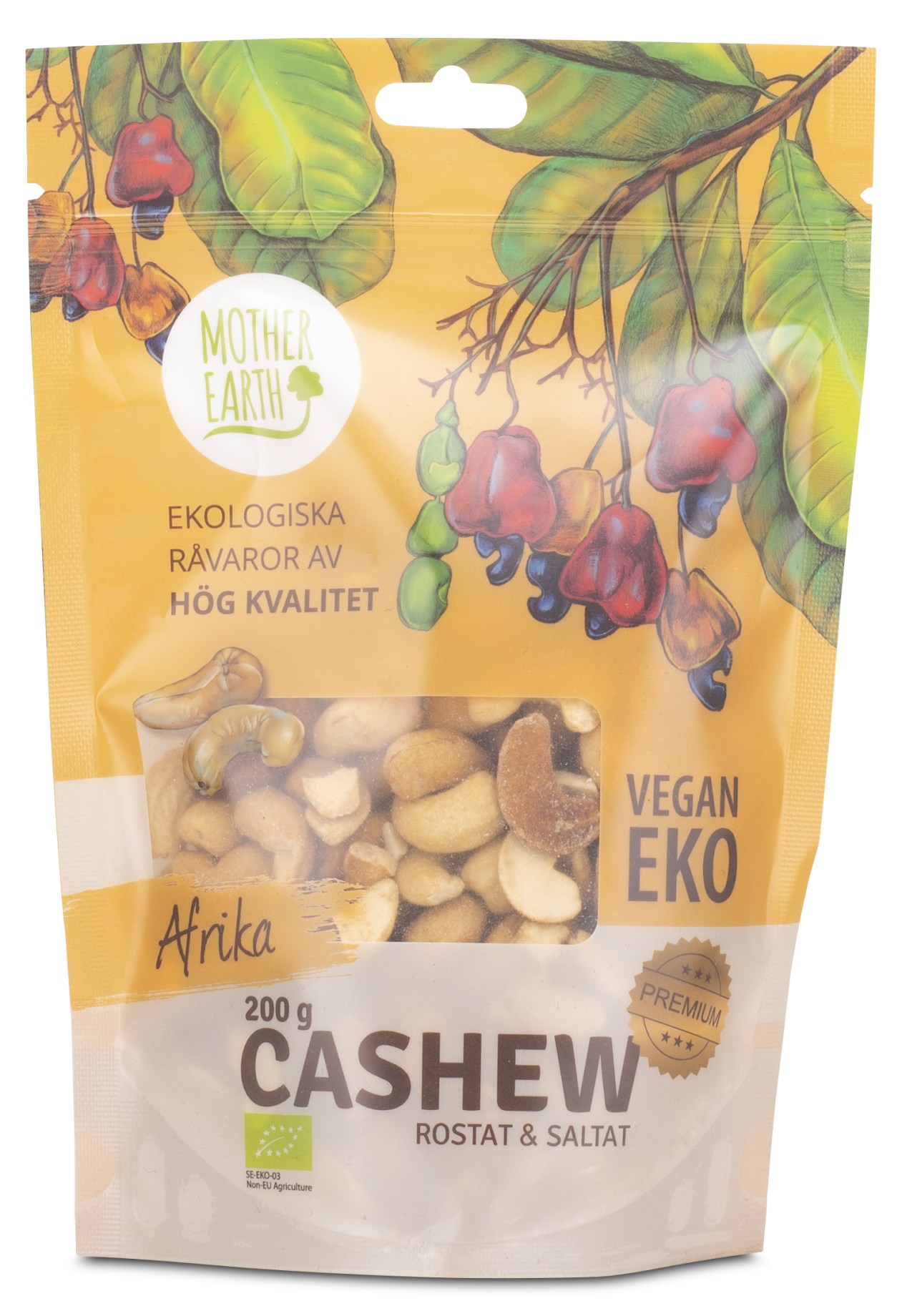 Mother Earth Cashew Premium R & S Eko sisältää ekologisia cashewpähkinöitä, jotka on paahdettu ja suolattu lisämaun vuoksi. Pähkinät ovat käteviä ottaa mukaan laukkuun herkulliseksi välipalaksi, kun tarvitset energiaa aterioiden välillä. Cashewpähkinät ovat myös erinomaisia keittiössä ja niitä käytetään usein sekä thaimaalaisissa että kiinalaisissa ruoissa.