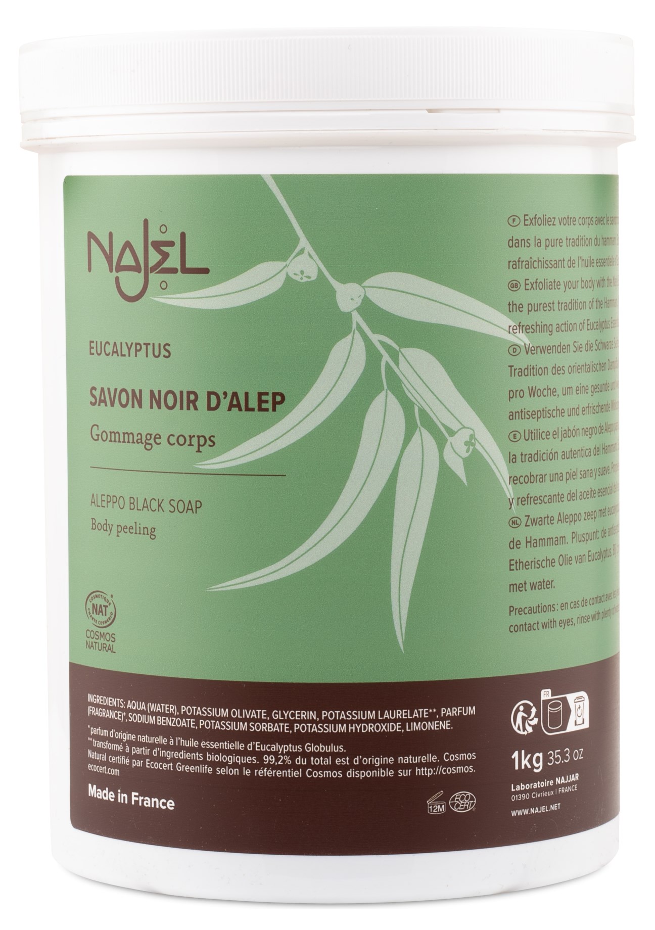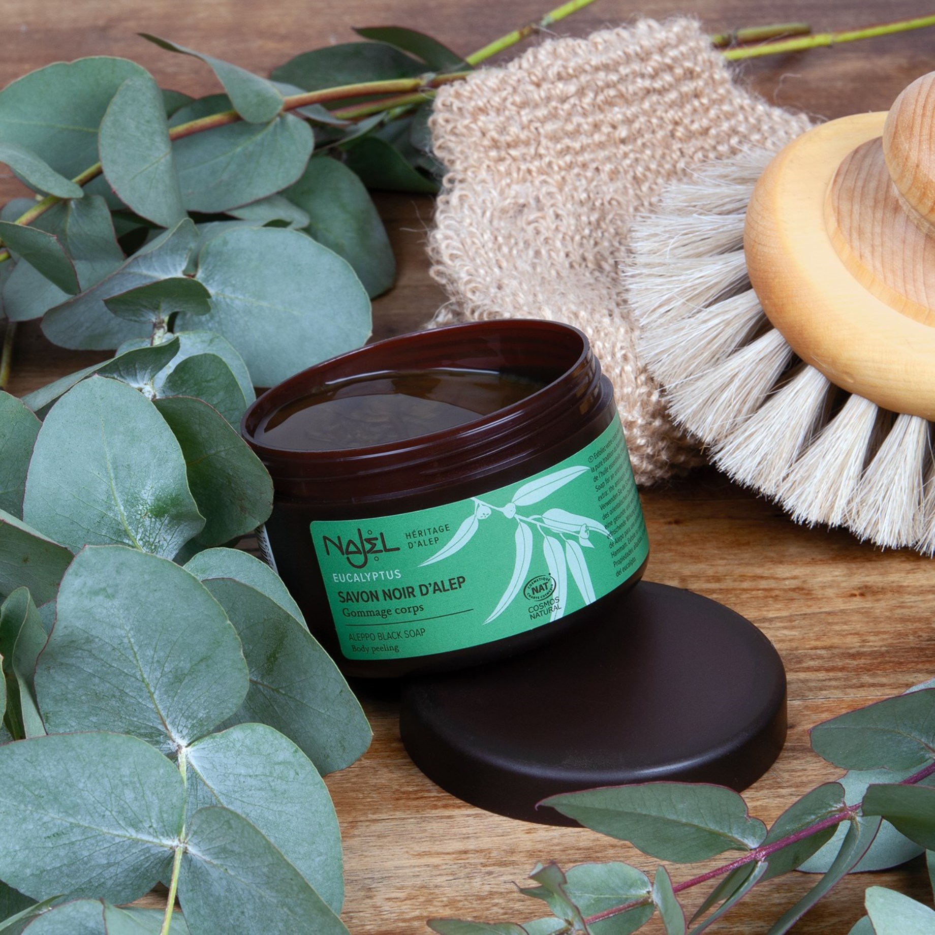 Najel Black Aleppo Soap on musta Aleppo-saippua, valmistettu ekologisesta neitsytoliiviöljystä ja laakerinmarjoista luonnolliseen ja hellävaraiseen puhdistukseen. Kuoriva saippua on rakeeton ja hellävarainen iholle, sopii kaikille ihotyypeille. Rikastettu eteerisellä Eukalyptus globulus -öljyllä raikkaan tuoksun ja virkistävän tunteen vuoksi. Käytä sellaisenaan tai yhdessä kuorintahansikkaan tai sienellä syväkuorintaan.