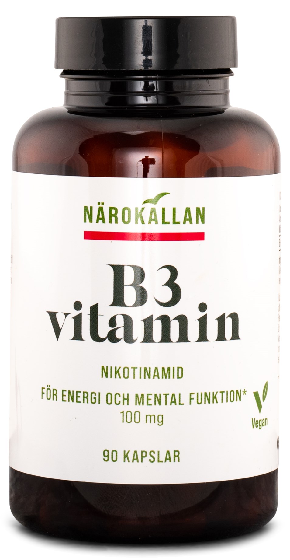 Närokällan B3 Nikotiiniamidi 100 mg sisältää B3-vitamiinia nikotiiniamidin muodossa. Nikotiiniamidi edistää muun muassa hermoston normaalia toimintaa, normaalia aineenvaihduntaa sekä auttaa vähentämään väsymystä ja uupumusta. Se edistää myös normaalin ihon ja limakalvojen ylläpitämistä. Närokällan B3 Nikotiiniamidi tulee kapseleina, jotka on helppo niellä veden kanssa.