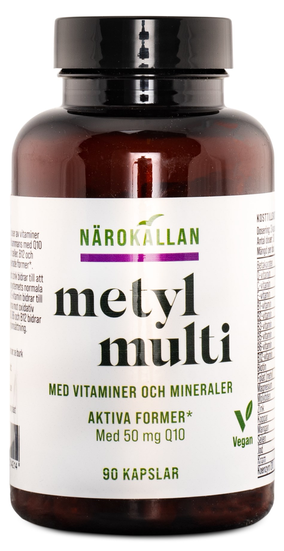 Närokällan Metyl Multi on monivitamiini ilman turhia lisäaineita. Se sisältää annoksen kaikkia vitamiineja ja mineraaleja yhdessä Q10:n kanssa solujen energiantarpeeseen. B12-vitamiini ja folaatti ovat metyleeratuissa muodoissaan, mikä mahdollistaa nopean ja tehokkaan imeytymisen. Närokällan Metyl Multia voi käyttää, jos olet vegaani ja vältät eläinperäisiä lähteitä. Närokällanin tuotteet ovat puhtaita ja laadukkaita. Kapselit on valmistettu pullulanista, joka on lempeä ruoansulatusjärjestelmälle ja hajoaa nopeammin mahassa.