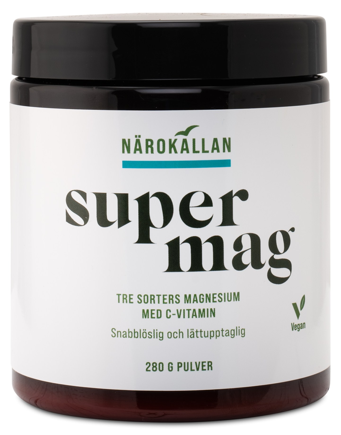 Närokällan Super Mag Pulver -magnesiumjauheen avulla voit kätevästi varmistaa päivittäisen annoksesi elintärkeää magnesium-mineraalia. Jokainen annos antaa sinulle 400 mg puhdasta magnesiumia kolmessa eri muodossa, ja sen lisäksi myös 250 mg C-vitamiinia. Magnesium on yksi kehon tärkeimmistä mineraaleista ja osallistuu lähes 300 entsyymiprosessiin. Se on muun muassa merkittävä normaalille lihastoiminnalle ja edistää hermoston normaalia toimintaa.
