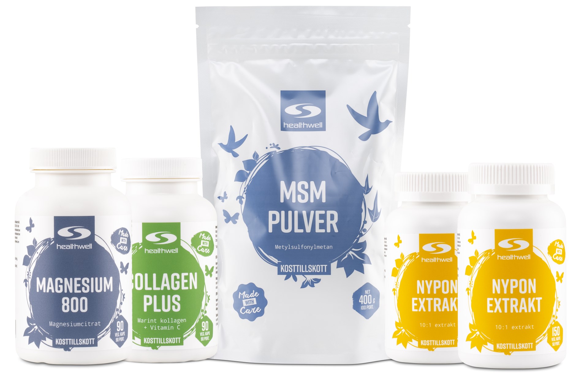 Tuotteet Nivel- ja lihaspaketissa on erityisesti koottu sinulle, joka haluat säilyttää hyvän nivel- ja lihasterveyden, sekä kun tunnet jäykkyyttä nivelissä ja lihaksissa. Tästä paketista löydät MSM:ää, kollageenia, puolukkakapseleita ja magnesiumia, lisäravinteet, jotka toimivat hyvin yhdessä. Nivelille suunnattu ravintolisäpaketti riittää jopa 100 annokseen, Collagen Plus ja Magnesium 800 jopa 90 annokseen.