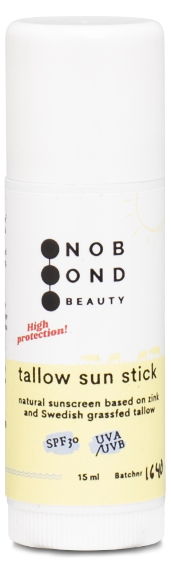 No Bond Beauty Tallow Sun Stick on fysikaalinen aurinkosuoja, joka perustuu non-nano-sinkkioksidiin ja titaanidioksidiin ja tarjoaa korkean suojan UVA- ja UVB-säteilyä vastaan. Ruotsalaisesta talista tehty pohja suojaa auringon säteiltä ja tuntuu samalla pehmentävältä iholla. Tallow Sun Stick on testattu voimassa olevien määräysten mukaisesti ja täyttää vaatimukset korkealle aurinkosuojalle SPF 30, laajakirjoiselle suojalle sekä suojalle UVA- ja UVB-säteilyä vastaan. Mineraaliaurinkosuoja jää ihon pinnalle ja heijastaa auringonsäteet sen sijaan, että imeytyisi ihoon. Aurinkosuoja sopii koko keholle.