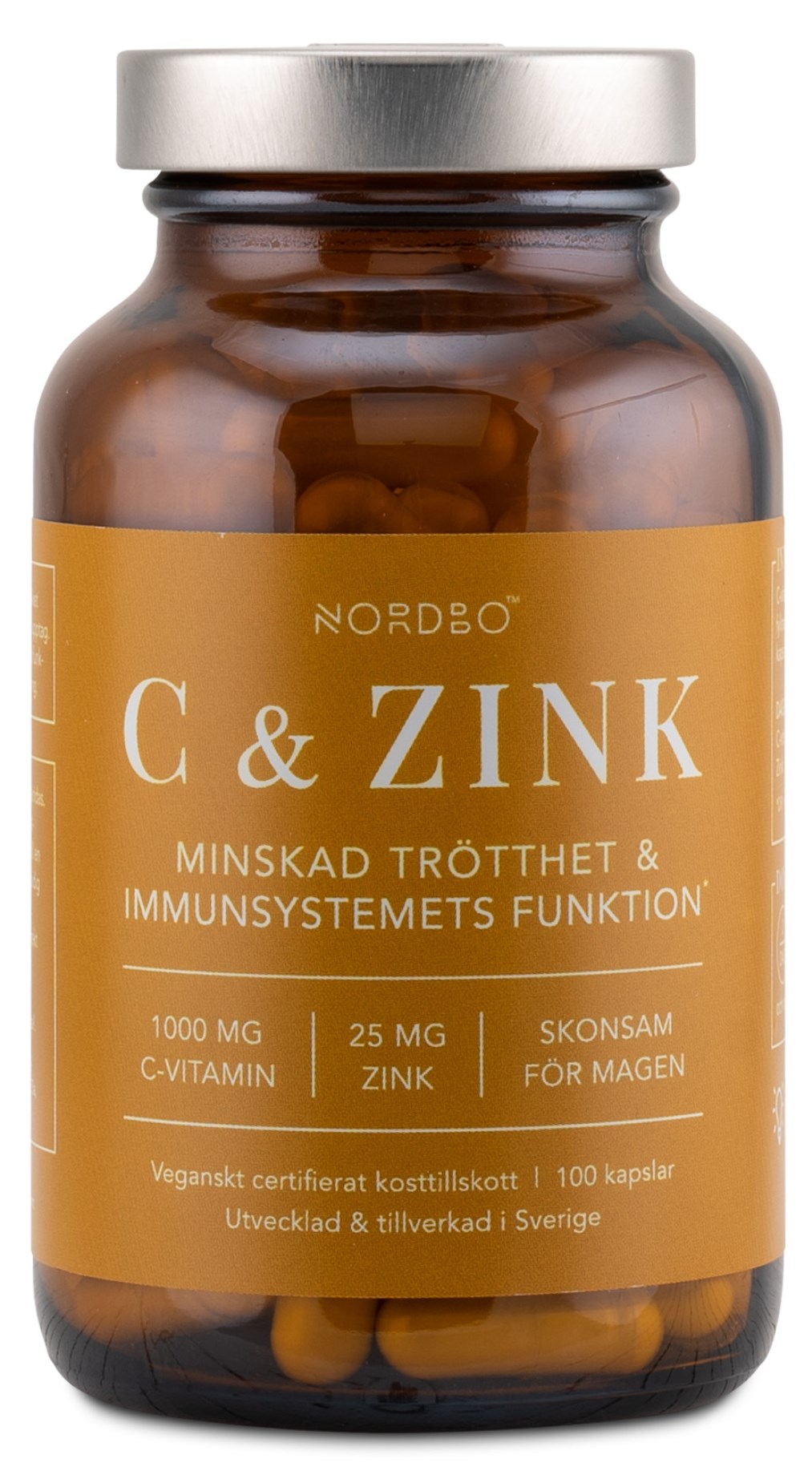 Nordbo C-vitamiini & Sinkki on ravintolisä, joka sisältää C-vitamiinia ja sinkkiä helposti imeytyvässä muodossa. Lisäravinne sisältää hapotonta ja vahvaa C-vitamiinia kalsiumaskorbaatin muodossa, mikä on sekä bioaktiivista että hellävaraista vatsalle. Sinkki on muodossa sinkkipikolinaatti, joka on erityisen helposti elimistön hyödynnettävissä. Sekä C-vitamiini että sinkki edistävät immuunijärjestelmän normaalia toimintaa, tukevat normaalin luuston säilymistä ja suojaavat soluja hapettumisstressiltä. Nordbo C-vitamiini & Sinkki on Ruotsissa valmistettu, vegaaninen ja Djurens Rätt:n hyväksymä.