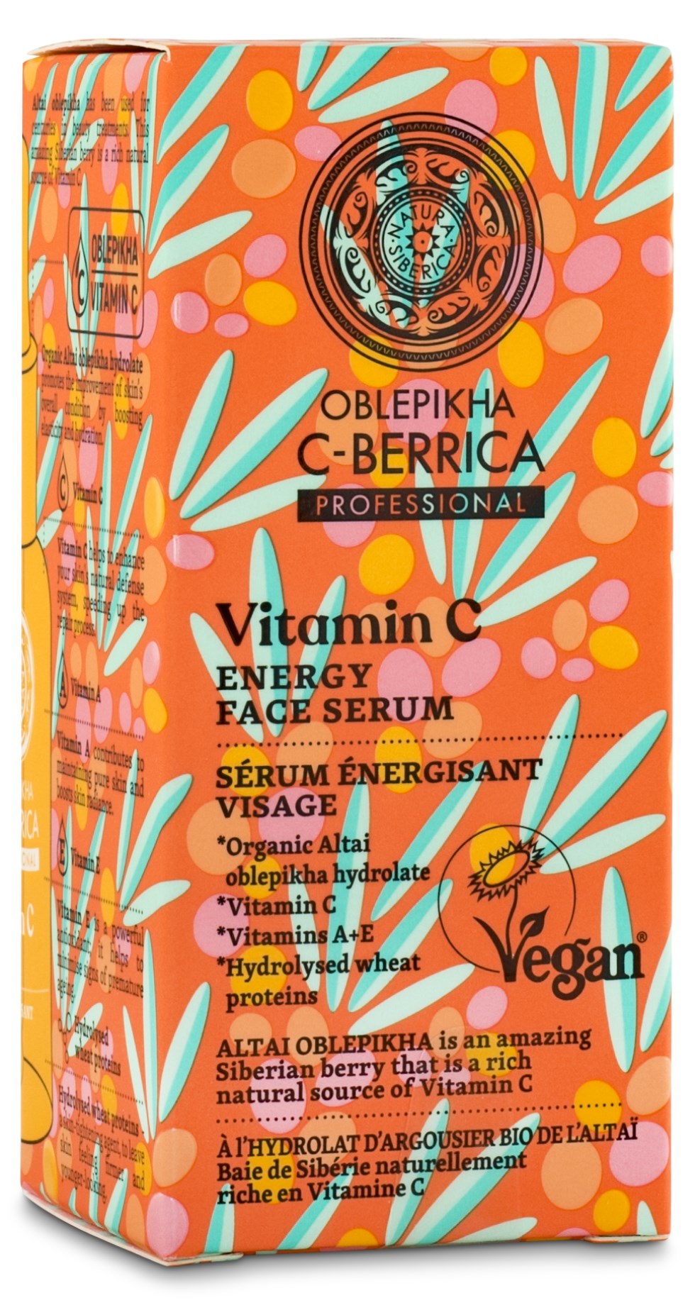 Natura Siberican Oblepikha C-Berrica kasvoseerumi on miellyttäviä kasvoseerumeita, jotka raikastavat ihosi. C-vitamiinia, joka vahvistaa ihon omia suojamekanismeja, ekologista tyrniä kosteuttaa, A-vitamiini auttaa ylläpitämään puhtaan ihon ja E-vitamiini edesauttaa ikääntymisen merkkien vähentämisessä. Vegaaninen ja ekologinen tuote!