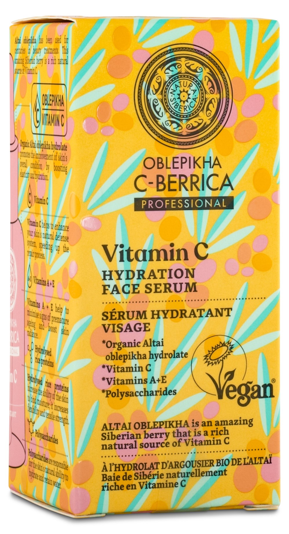 Natura Siberican Oblepikha C-Berrica kasvoseerumi on miellyttäviä kasvoseerumeita, jotka raikastavat ihosi. C-vitamiinia, joka vahvistaa ihon omia suojamekanismeja, ekologista tyrniä kosteuttaa, A-vitamiini auttaa ylläpitämään puhtaan ihon ja E-vitamiini edesauttaa ikääntymisen merkkien vähentämisessä. Vegaaninen ja ekologinen tuote!