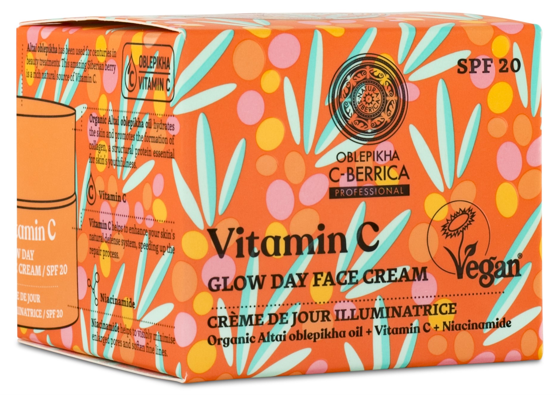 Natura Siberican Oblepikha C-Berrica Glow Day Face Cream antaa ihollesi uutta energiaa ja ihanaa hehkua. C-vitamiini auttaa vahvistamaan ihon luonnollisia suojamekanismeja ja luomutyrniöljy kosteuttaa. Päivävoide on erityisesti suunniteltu torjumaan kaupunkielämän vaikutuksia ihoon. Tuote on sekä vegaaninen että ekologinen.