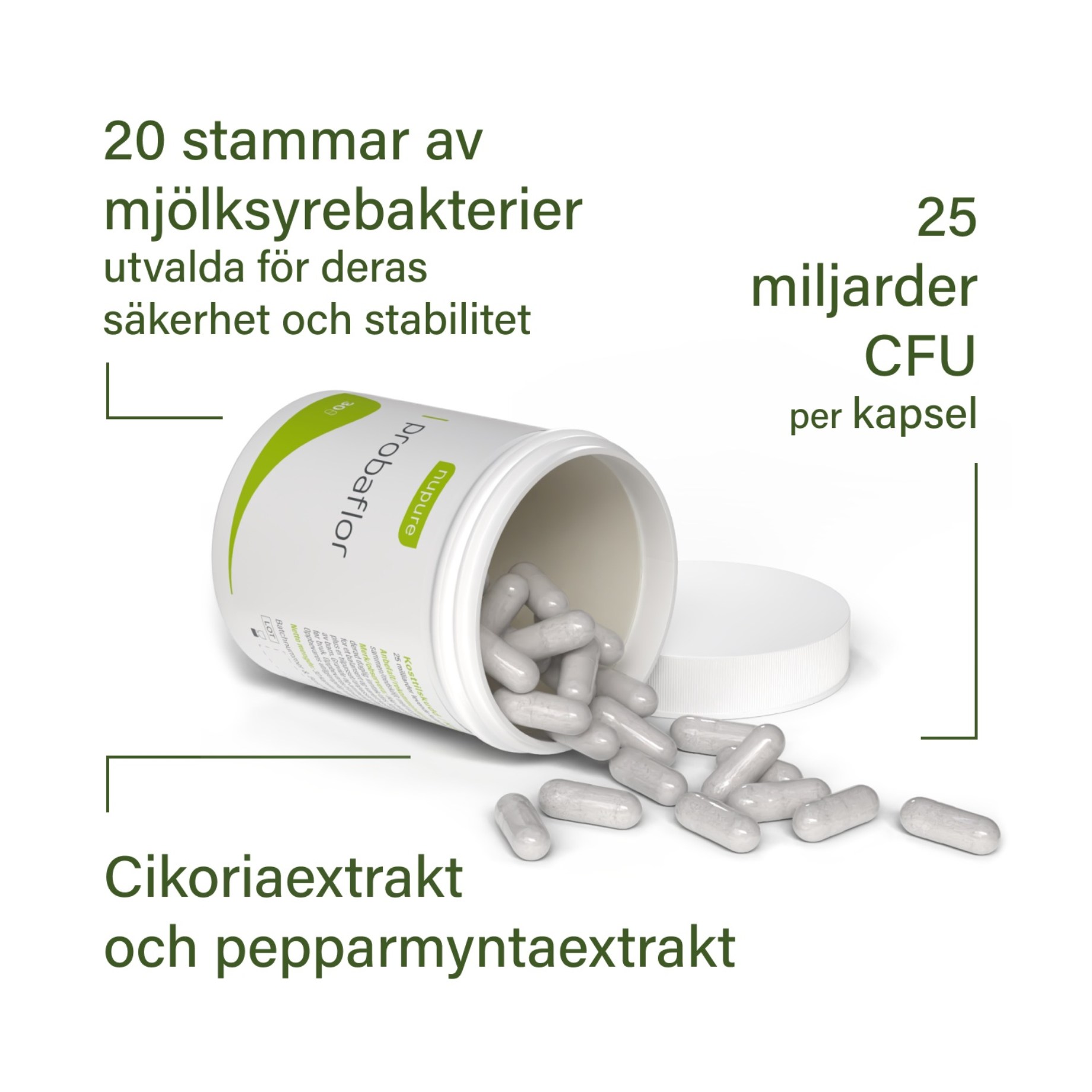 Nupure Probaflor sisältää hyödyllisiä bakteereja 11 eri kannasta. Jokaisessa kapselissa on 20 miljardia CFU:ta (Colony Forming Unit), jotka on suunniteltu tukemaan kehon luonnollista suolistomikrobiomia. Maitohappobakteerikannat on kehitetty viihtymään laajalla pH-alueella. Koostumus on kehitetty EU:ssa ja sisältää myös inuliinia - prebioottista kuitua, joka tukee hyödyllisten suolistobakteerien kasvua.