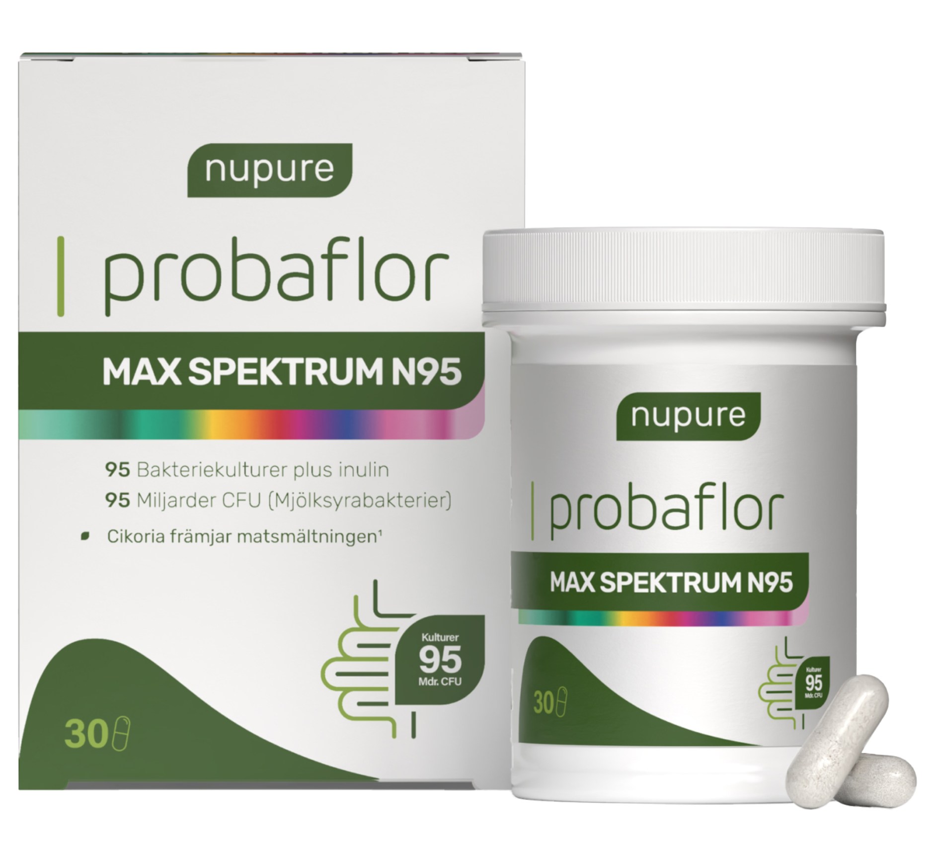 Nupure Probaflor MAX SPEKTRUM N95 sisältää maitohappobakteereja 95 eri kannasta ja on suunniteltu heijastamaan suoliston luonnollista monimuotoisuutta. Eri bakteereilla on kehossa erilaisia tehtäviä, ja mitä laajempi bakteerikantojen kirjo on, sitä monimuotoisempi on suolistomikrobisto. MAX SPEKTRUM N95:ssa on per annos peräti 95 miljardia CFU-bakteeria, mikä tarjoaa laajan kirjon hyödyllisiä bakteereja suoliston mikrobiomille. Kapselit ovat haponkestäviä, mikä maksimoi selviytymisen suolistossa.
