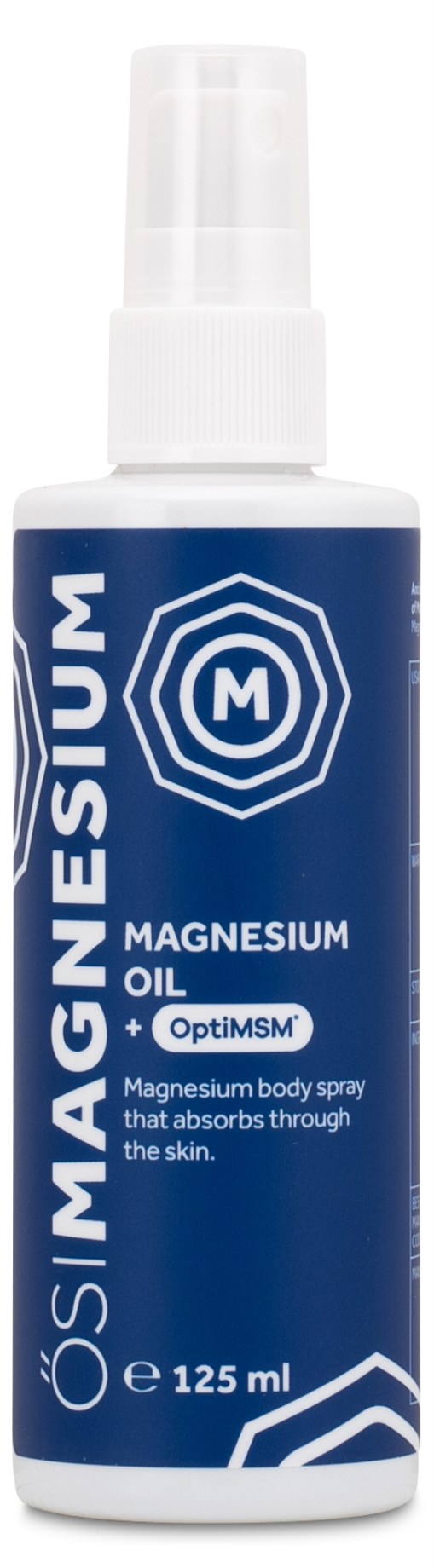 OsiMagnesium Magnesiumöljy +OptiMSM on ainutlaatuinen magnesiumtuote, jossa voit lisätä kehollesi ylimääräistä magnesiumia levittämällä magnesiumöljyä suoraan iholle. Magnesiumilla on rooli lihasten rentoutumisessa ja se myös edistää immuunijärjestelmän normaalia toimintaa. OptiMSM on patentoitu muoto MSM:stä, joka on luontaista ainetta nivelissämme. Käytä OsiMagnesium Magnesiumöljyä +OptiMSM päivittäisenä ihonhoitoöljynä lihaksille, puoli teelusikallista (2,5 ml) on sopiva määrä ja antaa 257 mg magnesiumia ja 312 mg MSM:ää.
