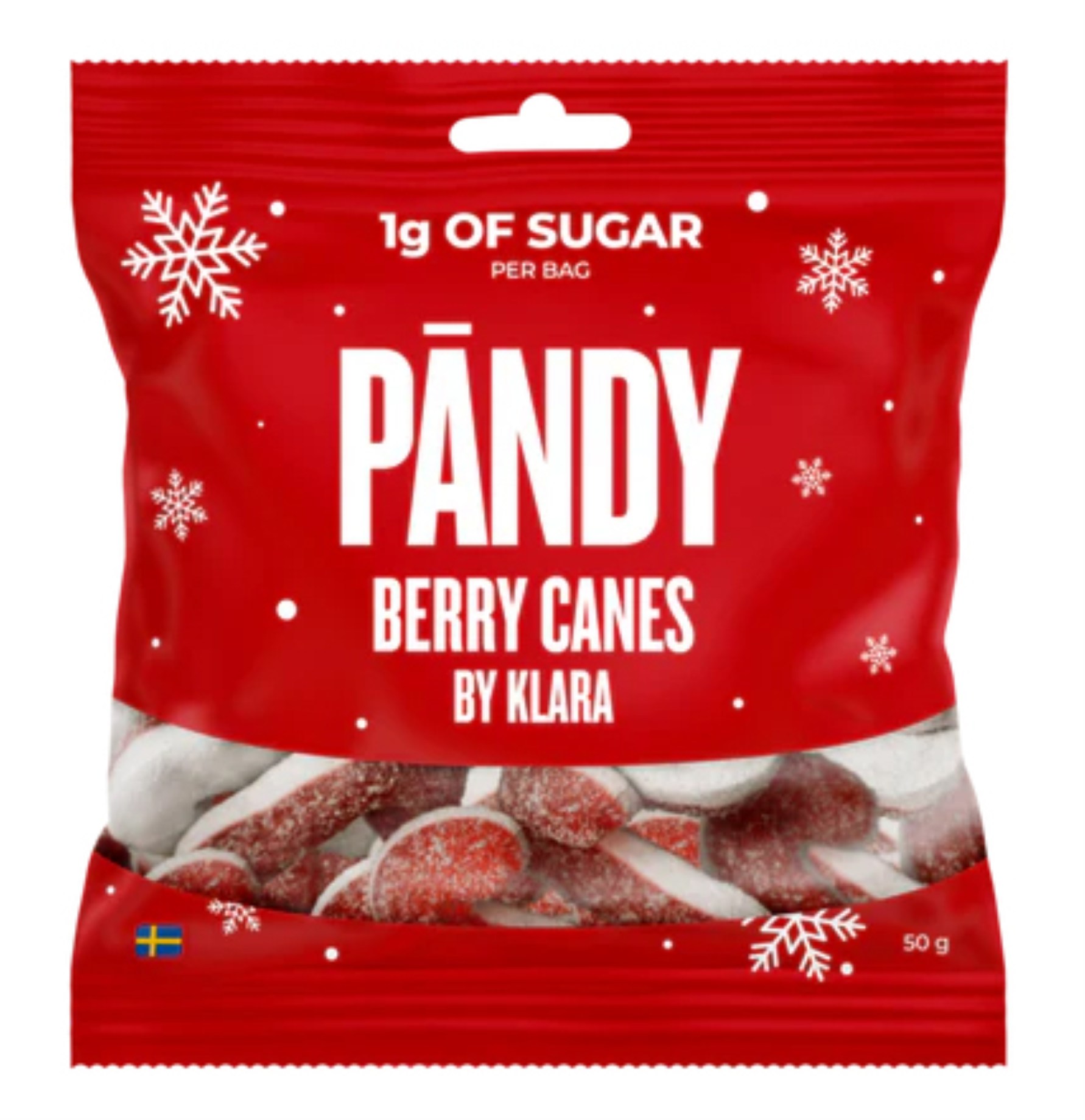 Pändy Candy Berry Canes by Klara on jouluisiin polkakarkkikeppeihin muotoiltuja makeisia, joissa on vain 1 gramma sokeria pussia kohden. Makea mansikka ja pehmeä vanilja muodostavat ihanan makuyhdistelmän, ja hyytelön ja vaahdon yhdistelmä tarjoaa miellyttävän rakenteen ja purutuntuman.
