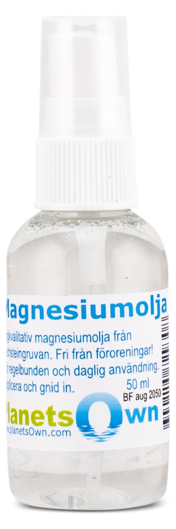 PlanetsOwn Magnesiumöljy sisältää erittäin puhdasta magnesiumkloridia, joka on peräisin Zechstein-kaivoksesta. Magnesiumöljyä on saatavilla suuremmassa ja pienemmässä koossa, joista jälkimmäinen on kätevässä spraymuodossa! Magnesiumöljy suihkutetaan kätevästi suoraan iholle tai levitetään kämmenellä käsien ja jalkojen voiteluun.