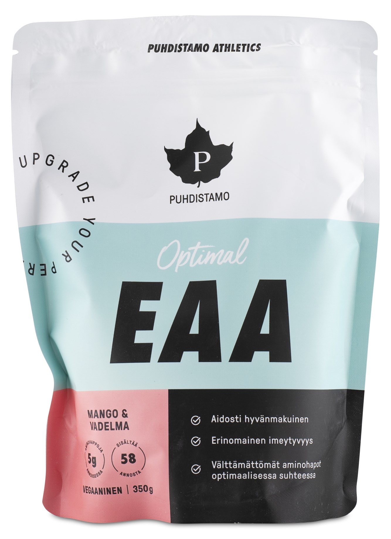 Puhdistamo Athletics EAA tarjoaa täydellisesti tasapainotetun sekoituksen kahdeksasta välttämättömästä aminohaposta. Koska keho ei voi tuottaa näitä aminohappoja itse, on tärkeää saada niitä ravinnon kautta. Koska aminohapot ovat vapaassa muodossa, ne voivat imeytyä nopeasti ja tehokkaasti kehoon. EAA:ta voi nauttia milloin tahansa päivän aikana, esimerkiksi välipalana tai treenin yhteydessä. Urheilijoille voi olla erityisen hyödyllistä täydentää ruokavaliotaan EAA:lla.