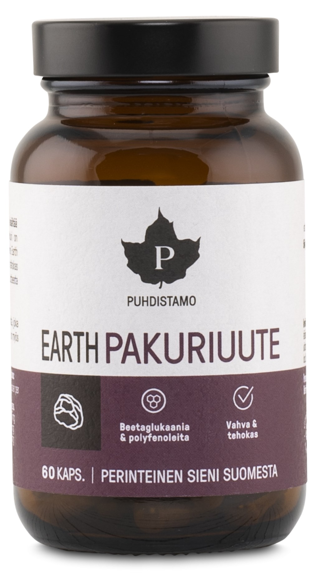 Puhdistamo Earth Pakuriuute on chaga-lisäravinne, jota kutsutaan myös pakurikääväksi. Puhdistamon Pakurikääpä Earth Pakuriuute on peräisin Suomesta ja se on veteen uutettu. Lisäravinne sisältää 10 % betaglukaaneja ja 10 % polyfenoleita. Ravintorikas sieni, joka sisältää muun muassa runsaasti betaglukaaneja.