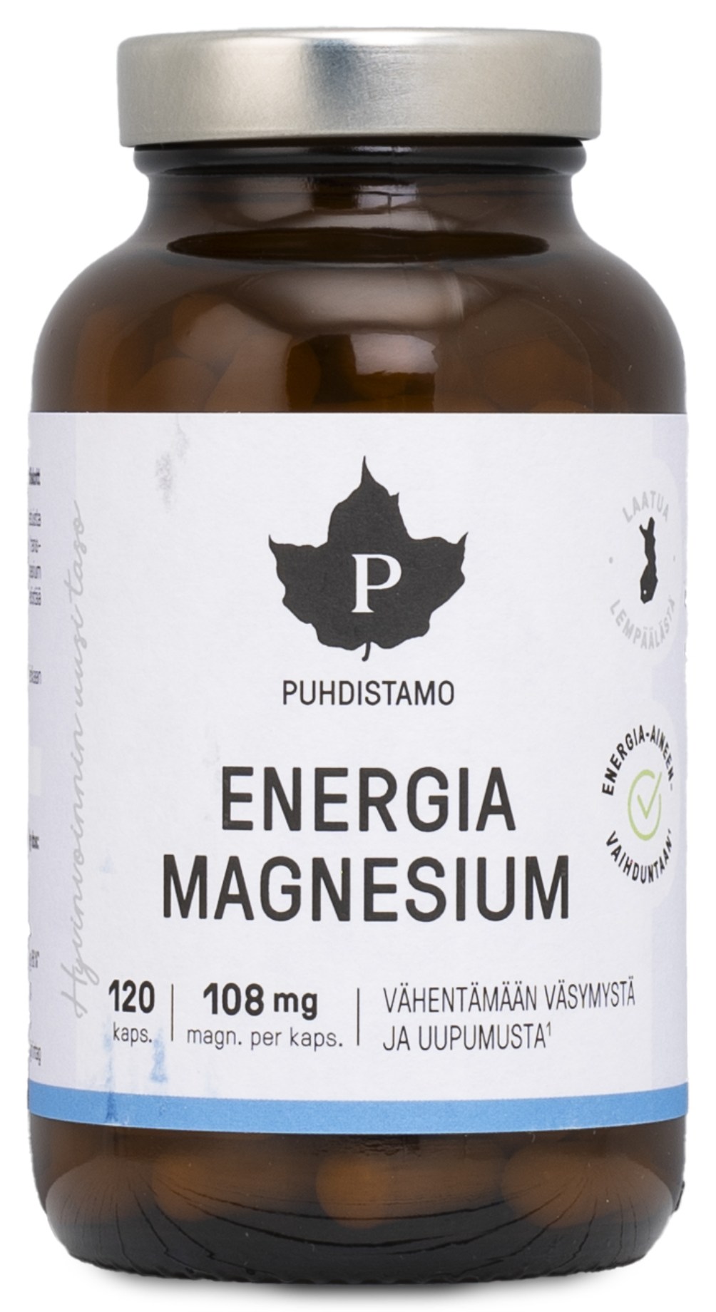 Puhdistamo Energia Magnesium sisältää tasapainoisen yhdistelmän korkealaatuista magnesiummalaattia, trans-resveratrolia ja asetyyli-L-karnitiinia samassa kapselissa. Magnesium on magnesiummalaatin muodossa, joka on sekä korkealaatuista että helposti imeytyvää. Energia Magnesium on vatsaystävällisempi kuin tavallinen magnesium ja sillä on erinomainen imeytymiskyky. Magnesium edistää normaalia energian aineenvaihduntaa ja auttaa vähentämään väsymystä ja uupumusta.