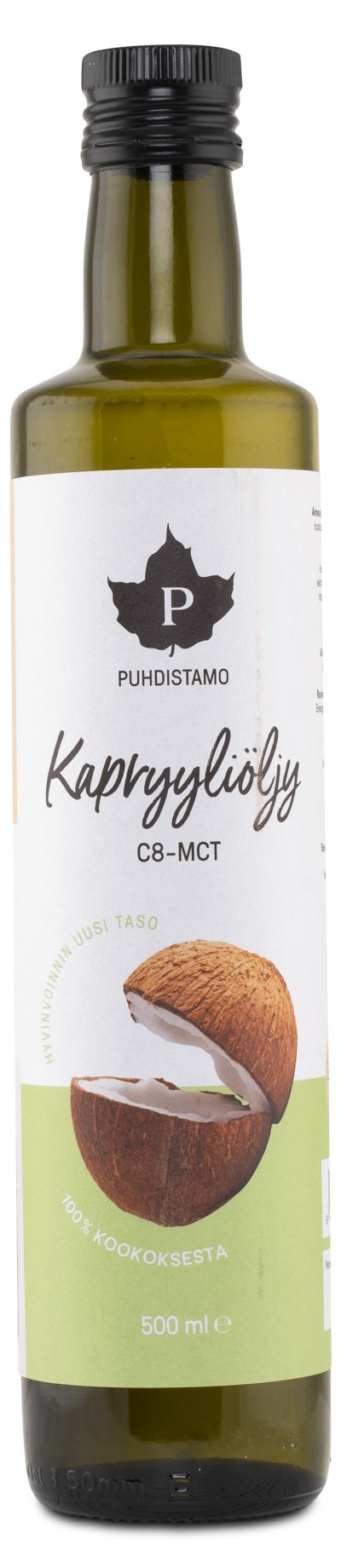 Puhdistamo Caprylic Acid Oil on kookospähkinästä saatava kapryyliöljy, joka sisältää 100 % kapryylihappoa (C8). Öljy on maultaan, tuoksultaan ja väriltään neutraali ja sopii erinomaisesti käytettäväksi kaikessa ruoassa ja juomassa antamaan keholle ylimääräistä energiabuustia. Huom! Kapryyliöljy kestää hyvin kuumuutta, mutta sitä ei suositella käytettäväksi paistamiseen.