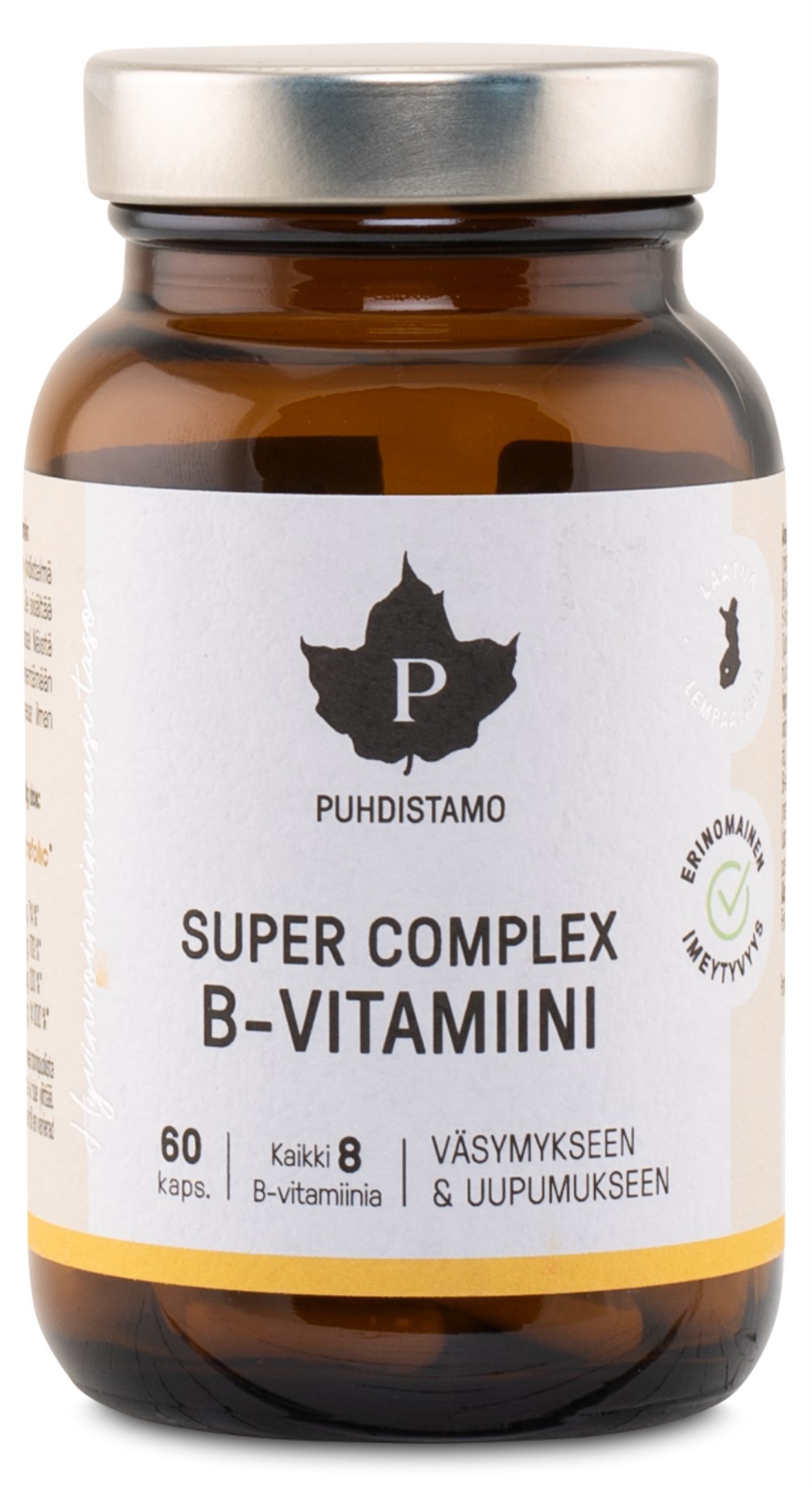 Puhdistamo Super Complex B-vitamiini sisältää B1-, B2-, B3-, B5-, B6-, B7-, B9- ja B12-vitamiineja - yhdessä kapselissa! Nämä ovat niin sanottuja aktiivisia B-vitamiineja. Niasiini, tiamiini, riboflaviini, B6-vitamiini ja B12-vitamiini edistävät hermoston normaalia toimintaa sekä normaalia energian aineenvaihduntaa. Lisäksi ne auttavat vähentämään väsymystä ja uupumusta. Foolihappo (B9) on tärkeässä roolissa kehon solujen jakautumisessa.