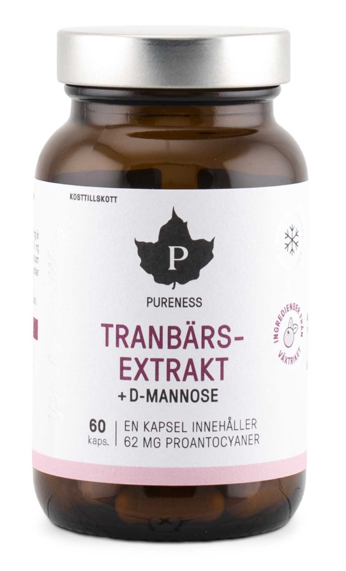Kapselit, jotka sisältävät Purenessilta tulevaa karpalokonsentraattia + D-mannoosia, sisältävät yhtä paljon karpalokonsentraattia ja D-mannoosia. Näistä 62 mg on proantosyanidiineja, jotka ovat luonnollisia fenoliyhdisteitä karpaloissa ja auttavat muun muassa antamaan marjoille niiden punaisen värin. D-mannoosi on yksinkertainen sokeri, jota löytyy hedelmistä ja marjoista ja jota esiintyy luonnollisesti myös tietyissä soluissa. Pureness Karpalokonsentraatti + D-mannoosi sopii sekä päivittäiseen käyttöön että tarpeen mukaan.