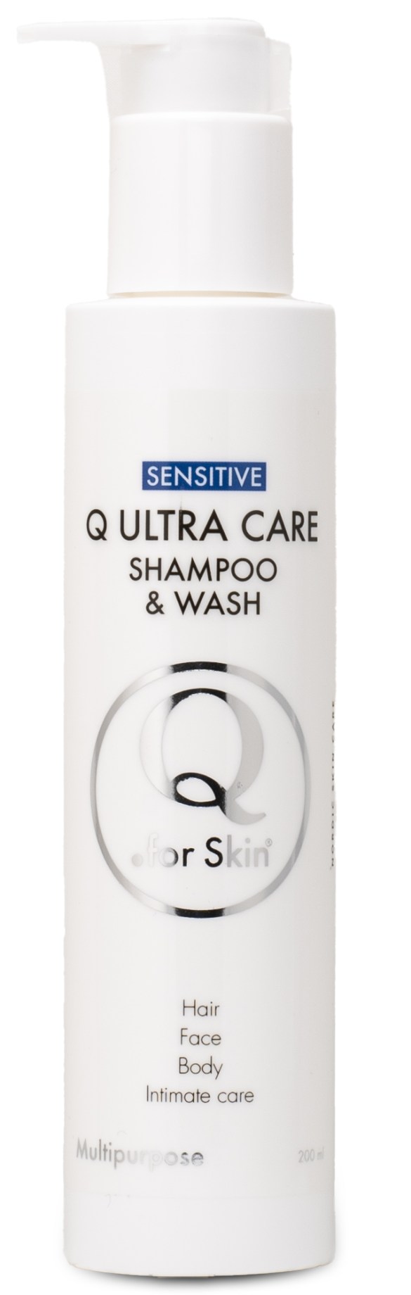 Q for Skin Q Ultra Care on hellävarainen ja monipuolinen monitoimipesu, joka toimii shampoona, saippuana ja intiimipesuna. Kookosperäiset tensidit, kauran antama ravinto, Aloe vera sekä B5-vitamiini kosteuttavat ja vahvistavat sekä ihoa että hiuksia. Q Ultra Care sopii hyvin päivittäiseen käyttöön osana pesurutiiniasi.