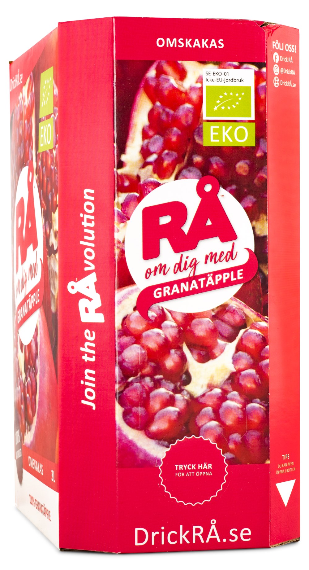 RÅ Granaattiomena EKO WellNOxilta on 100 % puhdasta granaattiomenamehua, täysin ilman lisäaineita. Luomugranaattiomenoista valmistettu mehu pastöroidaan ja pakataan bag-in-box-pakkaukseen. Bag-in-boxin nerokkuus piilee siinä, että se ei päästä ilmaa sisään, mikä takaa, että mehu säilyy vähintään kuukauden avaamisen jälkeen. Pakkauksessa on 3 litraa, mikä vastaa kuukauden kulutusta.