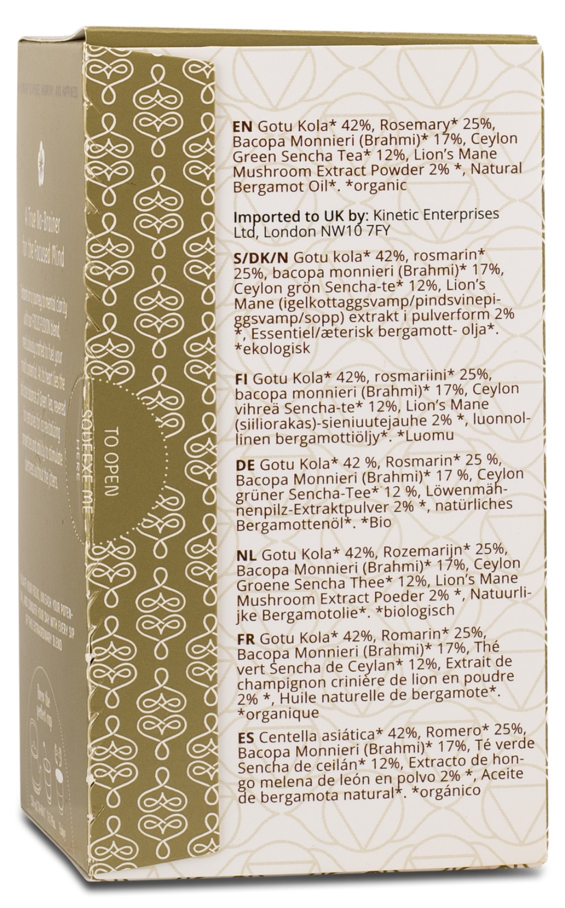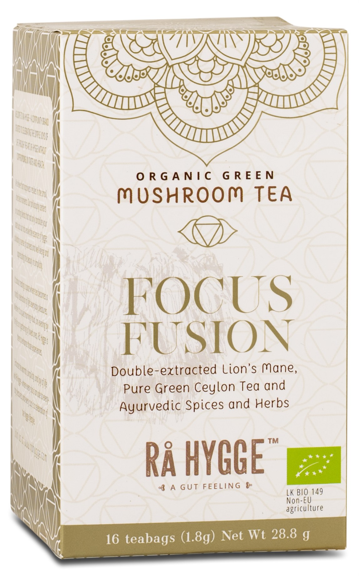 Rå Hyggen ainutlaatuinen teeseos Green Tea Focus Fusion Lions Mane yhdistää vihreän teen ja huolellisesti valitut yrtit, kuten gotu kolan, rosmariinin ja bacopa monnierin, voimakkaan Lion's Mane -uutteen kanssa. Jokainen ainesosa on valittu perinteisen käytön perusteella tarjoten nautittavan teehetken, kun taas vihreä tee tuo mukanaan luonnollista kofeiinia valppauden ja keskittymisen parantamiseksi. Tasapainoisen sekoituksen ja alhaisen kofeiinipitoisuuden ansiosta tämä on mieto vaihtoehto niille, jotka haluavat nauttia luonnollisesta, maukkaasta teestä keskittymistä vaativina hetkinä.