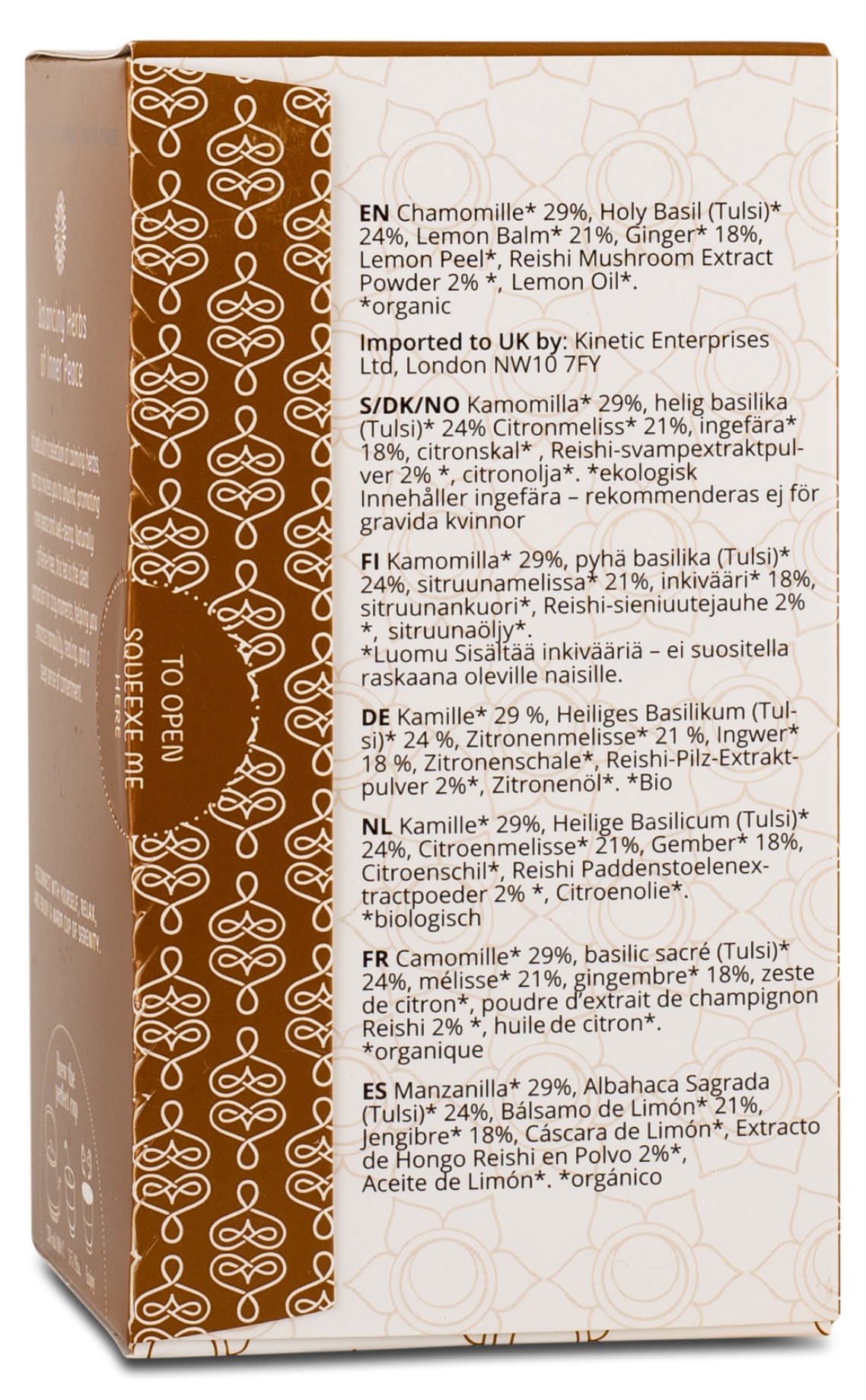 Herbal Tea Harmony Reishi on kofeiiniton yrttisekoitus Rå Hygge -merkiltä, joka sopii erinomaisesti rentouttavalle hetkelle. Tee sisältää uutetta reishistä, joka tunnetaan kiinalaisessa perinteessä "kuolemattomuuden sienenä". Tulsi, pyhäbasilika, toimii adaptogeenina ayurvedisessa lääketieteessä stressin vähentämiseksi ja tunteiden tasapainottamiseksi. Jokainen ainesosa on huolella valittu edistämään rauhoittavaa hetkeä, tehden tästä teestä täydellisen kumppanin rauhallisiin ja lämmittäviin hetkiin.