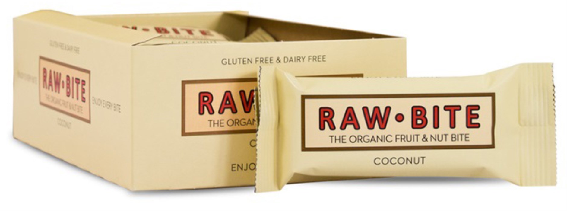 RAWBITE-kookos on valmistettu 100% luonnollisista, luomusta, sekä raaoista raakaruoka ainesosista. RawBite on hedelmä- ja pähkinäpatukka, joka on maidoton, mutaon, gluteeniton, munaton ja sokeriton. RawBite ei sisällä keinotekoisista maku- ja väriaineista. Se on yksinkertaisesti terveellinen patukka, joka sopii erinomaisesti otettavaksi mukaan laukkuun tai kahvitauolle!