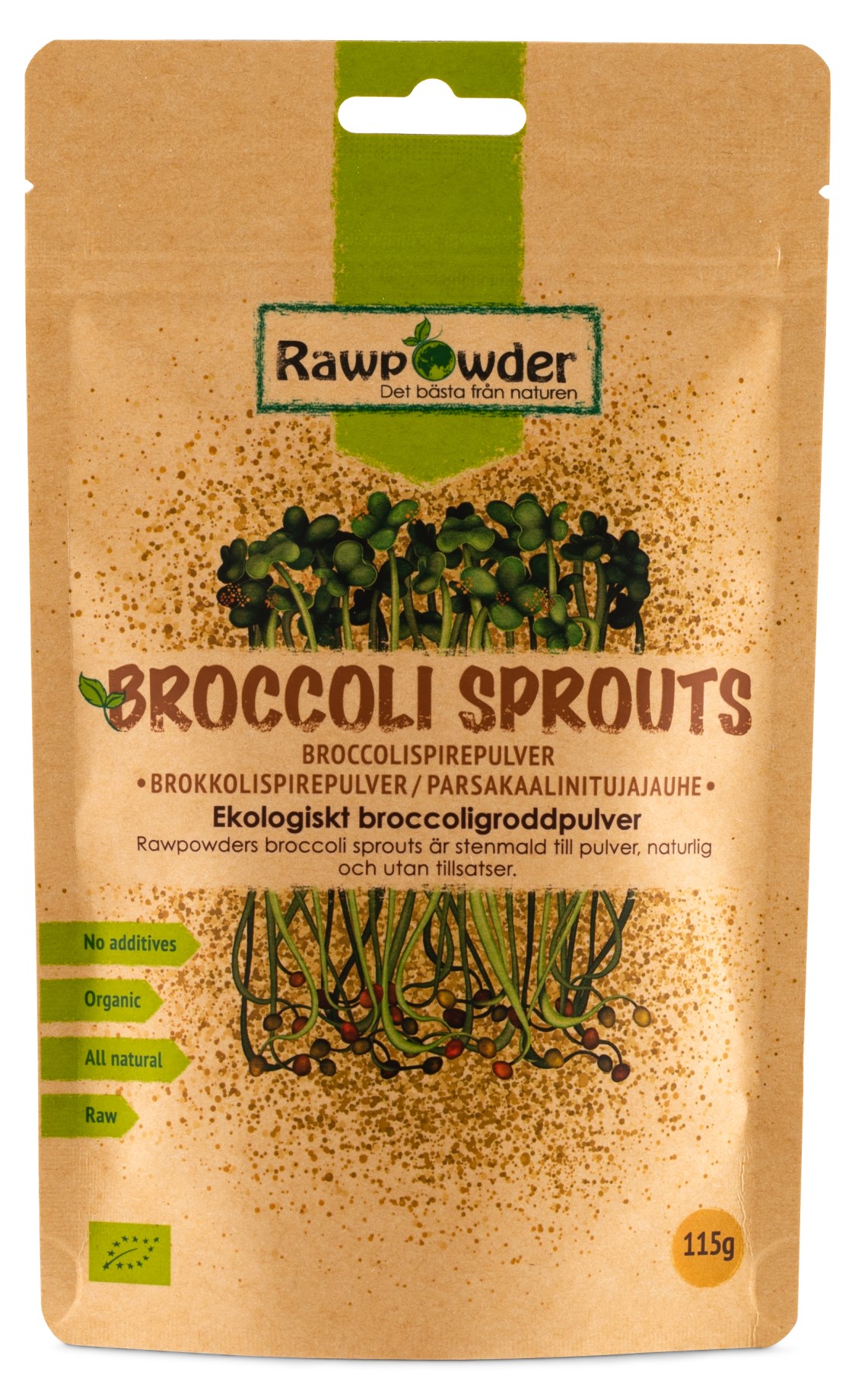 RawPowders Parsakaalin idut, Sprouts, ovat luomuparsakaalin ituja, joita voidaan helposti lisätä smoothieihin, viiliin tai vaikkapa lasilliseen vettä. Jauhe sisältää runsaasti ravintoaineita ja se sisältää aineen nimeltä sulforafaani, tehokas antioksidantti, joka auttaa suojaamaan kehon soluja hapettumisstressiltä. Aine löytyy luonnostaan kasvisruoissa, kuten parsakaalissa, mutta se on 40-50 kertaa suuremmassa määrässä parsakaalin iduissa.