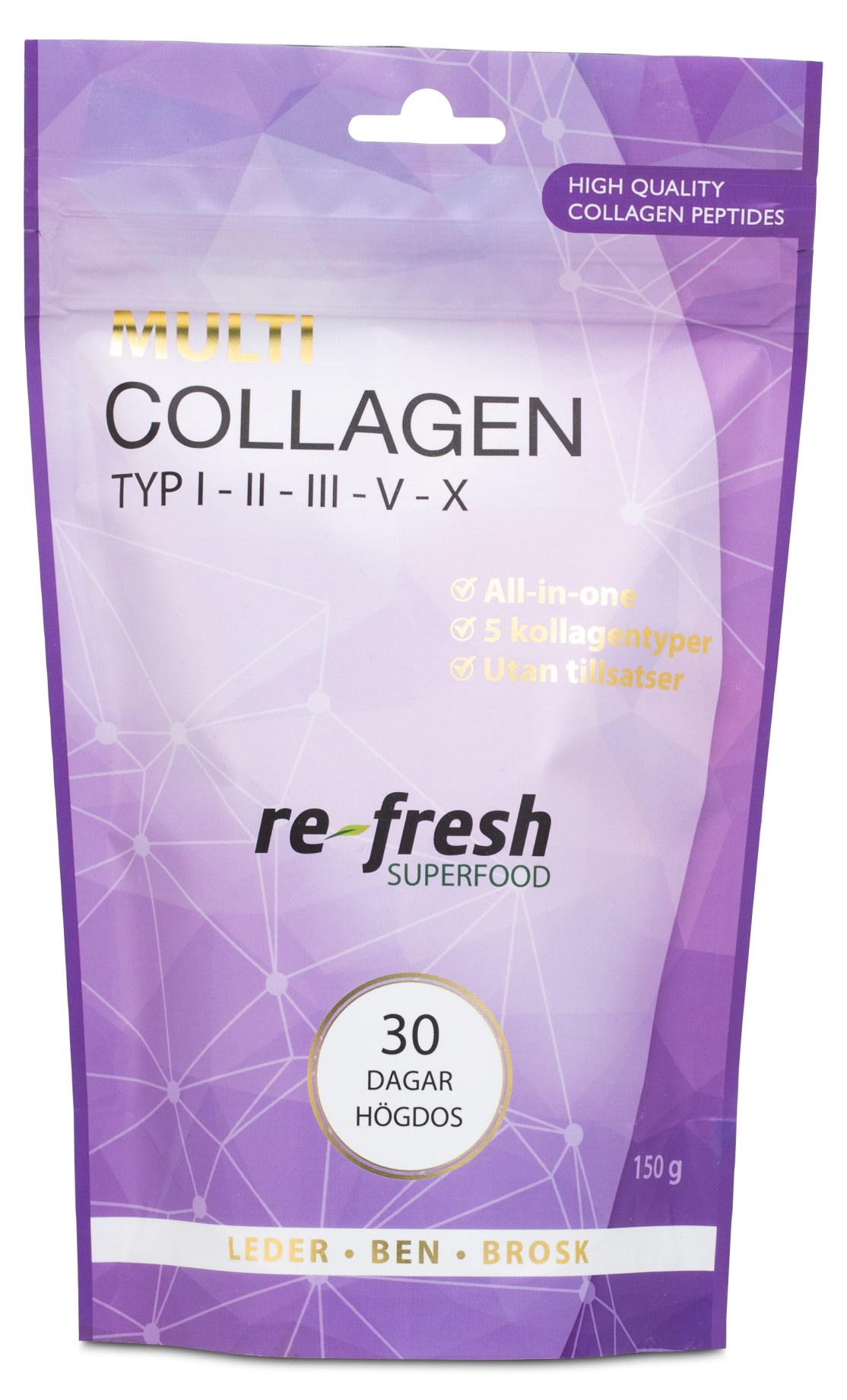 Re-fresh Superfood MultiCollagen on viiden kollageenityypin lisäravinne, joka sisältää neljä yleistä rakenteellista kollageenityyppiä 1, 2, 3 ja 5 sekä uuden rakennetyypin 10. MultiCollagen on puhdas tuote, joka tarjoaa korkean annoksen kollageenia ravintoaineista, jotka tulevat ruohoa syövistä nautaeläimistä, valkoisesta ruokakalasta, munankuoren kalvosta ja Avian Sternumista (kana). - Huom! Nämä kaikki ovat ympäristöystävällisesti hyödyntäen elintarviketuottajien sivutuotteita.