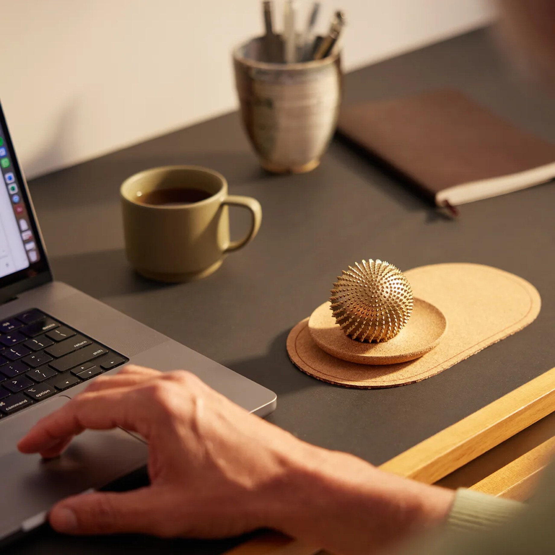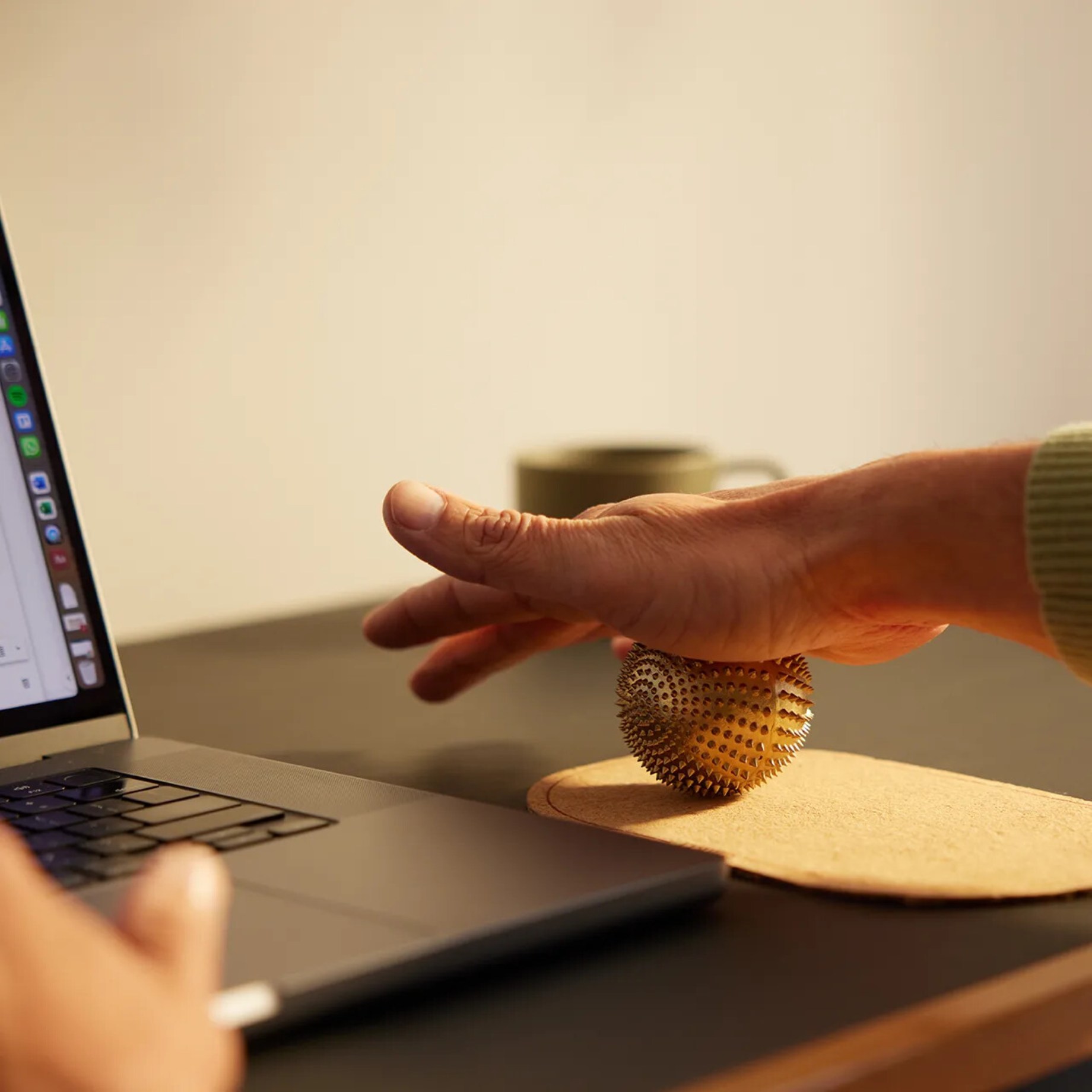 Onko sinulla jännittyneitä lihaksia treenistä tai stressistä? Silloin akupainantapallo voi olla sinulle sopiva! Shakti Wonderball on messinkipallo, jossa on 658 erityisen terävää piikkiä, täydellinen tukkoisten ja arkojen lihasten rentouttamiseen koko kehossa. Se painaa 200 grammaa ja sen halkaisija on vain 6,5 cm, mikä tekee siitä täydellisen kohdennettuihin ja tarkkoihin hoitoihin, kuten triggerpistehierontaan. Mukana tulee luonnonkorkista valmistettu rullausalusta ja korkkiteline pallolle.