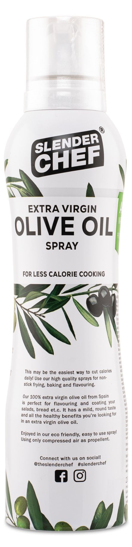 Slender Chef Extra Virgin Olive Oil Spray on kätevä spraymuotoinen oliiviöljy, joka auttaa vähentämään rasvan käyttöä ruoanlaitossa. Vain 1 g rasvaa per suihkaus, se levittyy tasaisesti jopa suuremmille pinnoille painepakkausmekanisminsa ansiosta. Täydellinen paistinpannulle tai suoraan ruoan päälle, kuten uunissa paahdettaville perunoille.