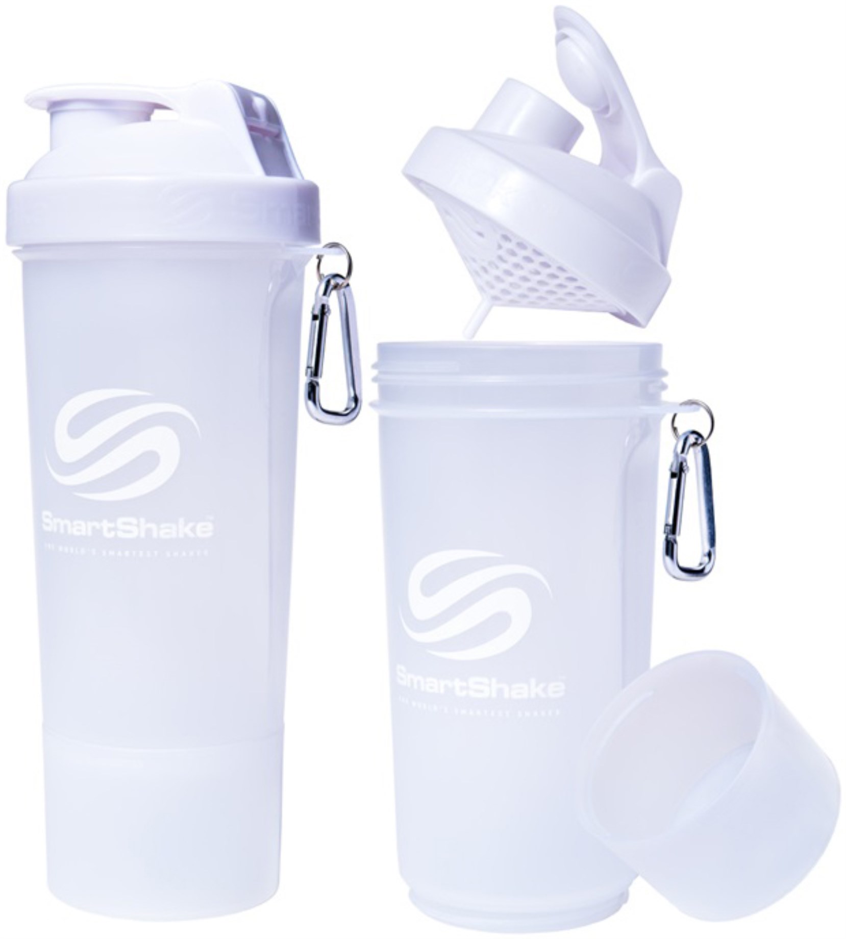SmartShake Slim on kätevämpi versio SmartShakesta, ja sen avulla on helppo lisätä proteiinijauhetta ja urheilujuomia osaksi treeniä. Shakerin tilavuus on 500 ml ja sen alaosassa on ylimääräinen säiliö, jossa voit säilyttää toista lisäravinneannosta. Voit esimerkiksi sekoittaa shakeriin ensin urheilujuoman, jota juot treenin aikana. Säilytä samalla shakerin säiliössä palautumiseen tarkoitettua proteiinijauhetta, jonka voit kaataa shakeriin ja sekoittaa treenin jälkeen, kun urheilujuoma on loppunut. Kätevää, helppoa ja fiksua!