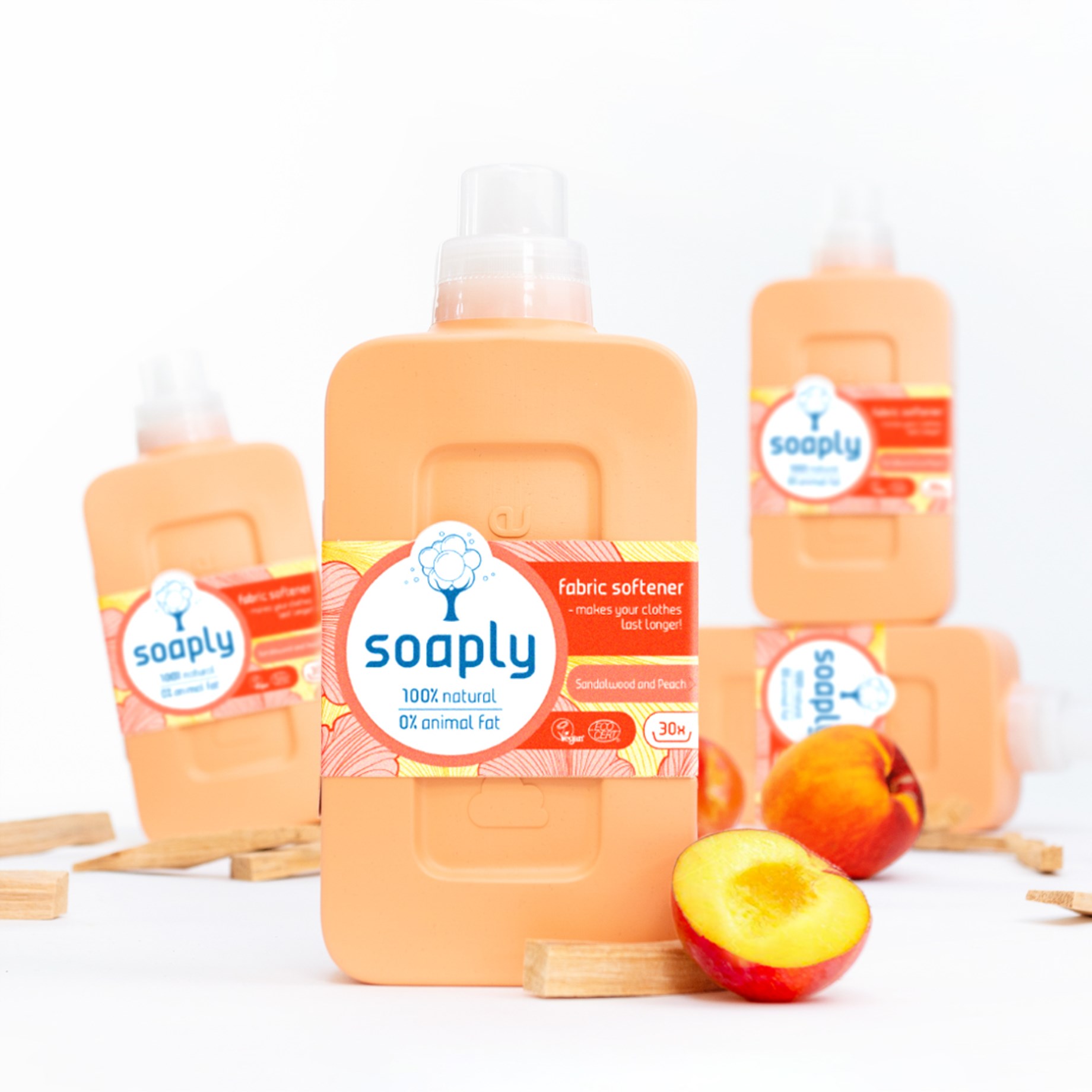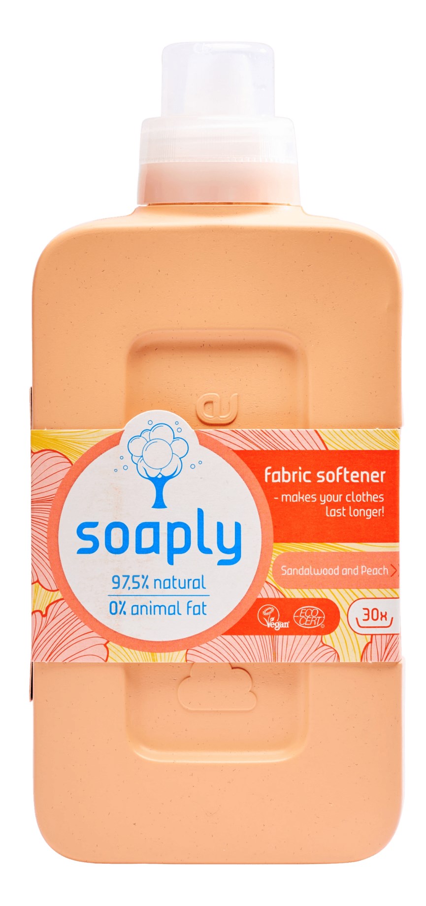 Soaply Huuhteluaine Sandalwood & Peach on kermainen, pehmentävä huuhteluaine, joka antaa hienovaraisen tuoksun. Huuhteluaine sisältää 97,55 % luonnollisia ainesosia, on täysin vegaaninen ja vapaa mikromuoveista, ja sopii kaikille pesulajeille. Koe pehmeä ja miellyttävä tunne vaatteissa ja muussa pyykissä Soaplyn huuhteluaineen avulla!