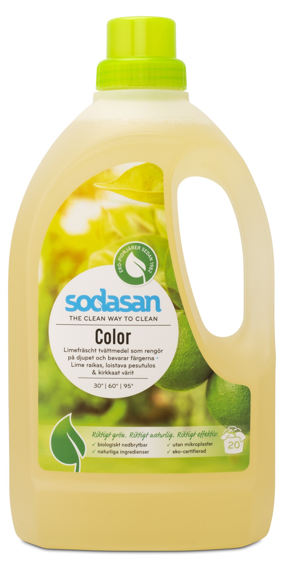 Sodasan Lime Pyykinpesuaine saa raikkaan sitruksisen tuoksunsa eteerisistä öljyistä. Se sopii kaikenlaiseen pyykkiin ja on dermatologisesti testattu.