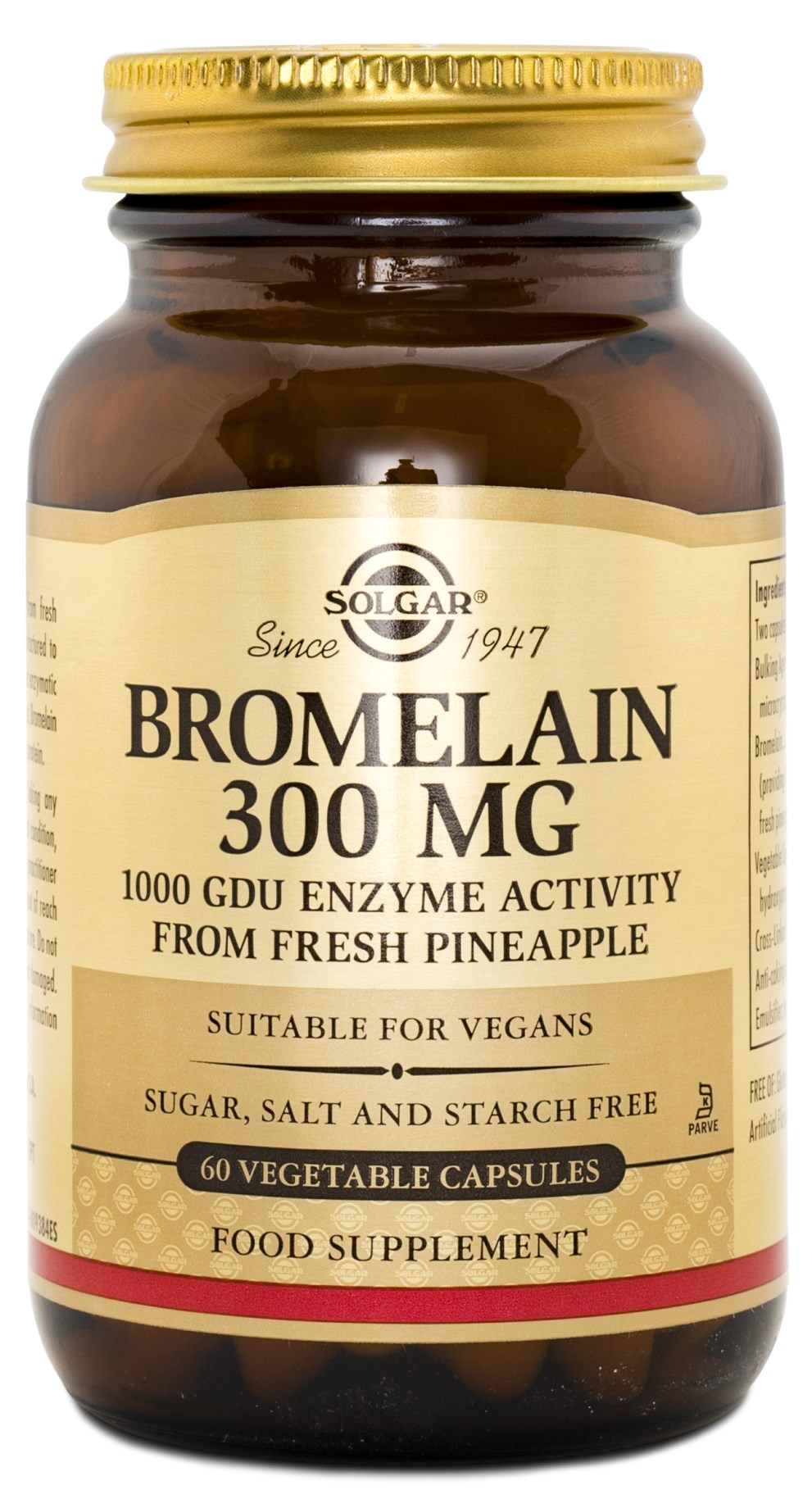 Solgar Bromelaiini 300 mg sisältää proteiineja hajottavaa entsyymiä bromelaiinia, jota kutsutaan myös bromeliiniksi. Tämä entsyymi saadaan ananaksesta ja on muun muassa syy siihen, miksi jotkut ihmiset voivat kokea suun kutinaa syödessään ananasta. Solgar Bromelaiini 300 mg:ia käytetään esimerkiksi ruohon- tai koivun siitepölystä johtuvassa siitepölyallergiassa. Se voi auttaa limakalvojen turvotukseen, erityisesti nenässä ja poskionteloissa. Käytä Solgar Bromelaiini 300 mg aterioiden välillä tehostaaksesi sen vaikutusta. Jos haluat sen sijaan käyttää bromelaiinia ruoansulatuksen tukemiseen, ota kapselit aterian yhteydessä.