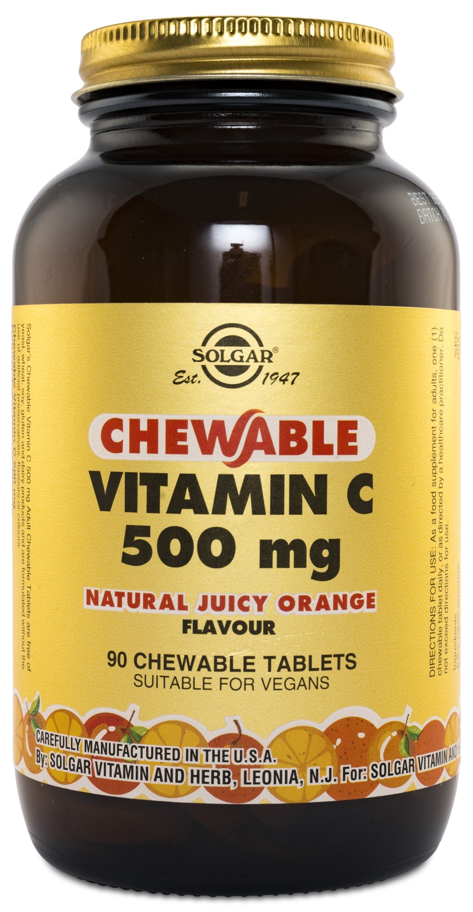 Solgar Chewable C-vitamiini sisältää 500 mg C-vitamiinia per tabletti korkealaatuisista C-vitamiinin lähteistä, joita kehon on helppo hyödyntää. Solgarin C-vitamiini sisältää myös luonnollisia hedelmäuutteita acerolasta ja ruusunmarjoista. Solgarin C-vitamiinia on saatavilla käytännöllisissä ja maukkaissa purutableteissa. - Suositeltu annos on 1-2 tablettia päivässä.