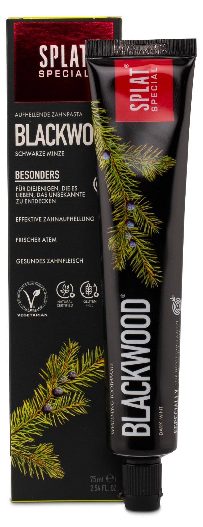 Splat Blackwood on hammastahna, joka on erityisesti suunniteltu tehokkaasti valkaisemaan kiillettä vahingoittamatta sitä. Hammastahnassa on korkea pitoisuus puuhiiltä, joka poistaa plakkia ja värjäytymiä esimerkiksi kahvista ja teestä, ja voi tehdä hampaista jopa 2 sävyä valkoisemmat. Se sisältää myös kataja-uutetta ja steviakstraktiä, jotka edistävät ikenien terveyttä, sekä kosteuttavia aineita, jotka rauhoittavat ikeniä. Aktiivinen ainesosa biosoli yhdessä mentolin kanssa antaa raikkaan hengityksen. Fluoriton, alkoholiton, ei sisällä voimakkaita tensidejä (SLS) eikä titaanidioksidia.