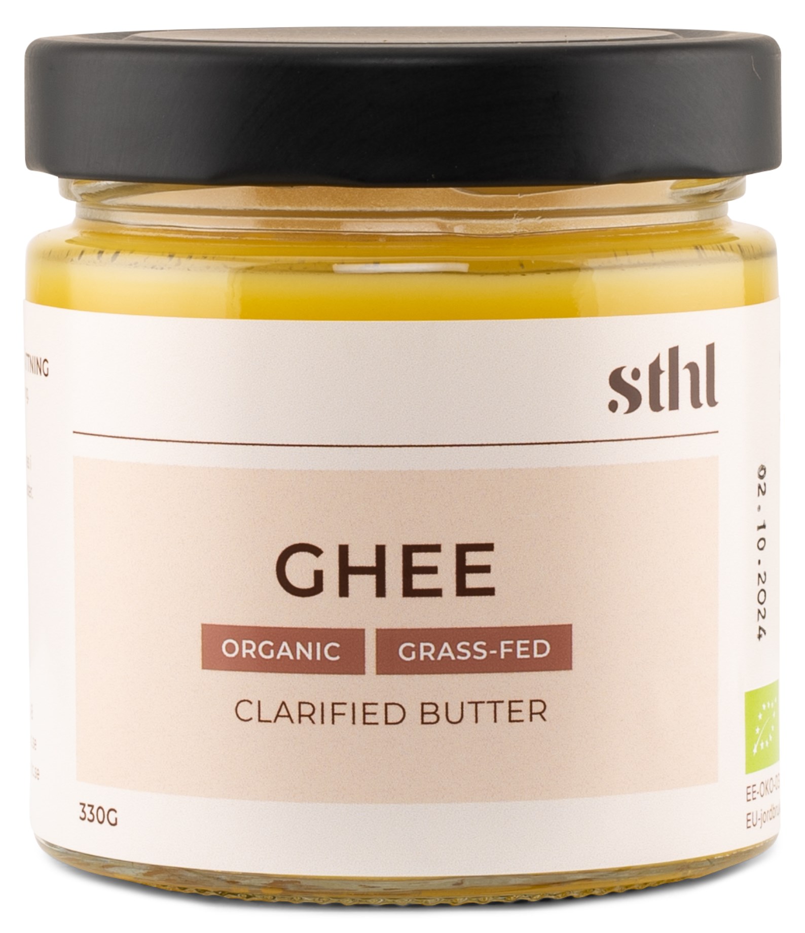 STHL Ghee, Luomu on luonnonmukainen, kirkastettu voi, joka antaa rikkaan maun. Gheen avulla ruoanlaitossa tulee esiin perinteinen voin maku yhdistettynä pähkinään, paahdettuun ja makeaan sävyyn. Gheen valmistusprosessissa lähes kaikki laktoosi ja maitoproteiini poistetaan, joten se on vaihtoehto sinulle, jos olet herkkä voille. Jos olet allerginen maitoproteiinille, sinun tulisi silti välttää gheeta, koska se sisältää maitoproteiinin jäämiä. STHL Ghee, Luomu valmistetaan ruohoa syövien lehmien kermasta, lehmät elävät sellaista elämää kuten lehmien kuuluu elää. Täydellinen paistamiseen!