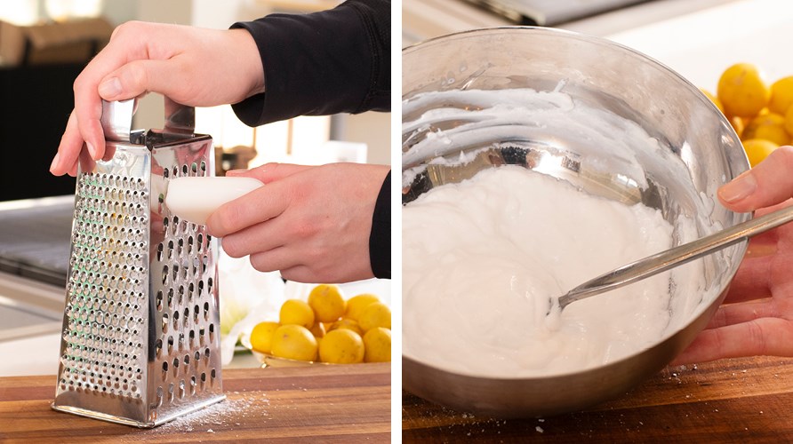 1. Raasta saippua raastimella ja sekoita se lämpimään veteen.