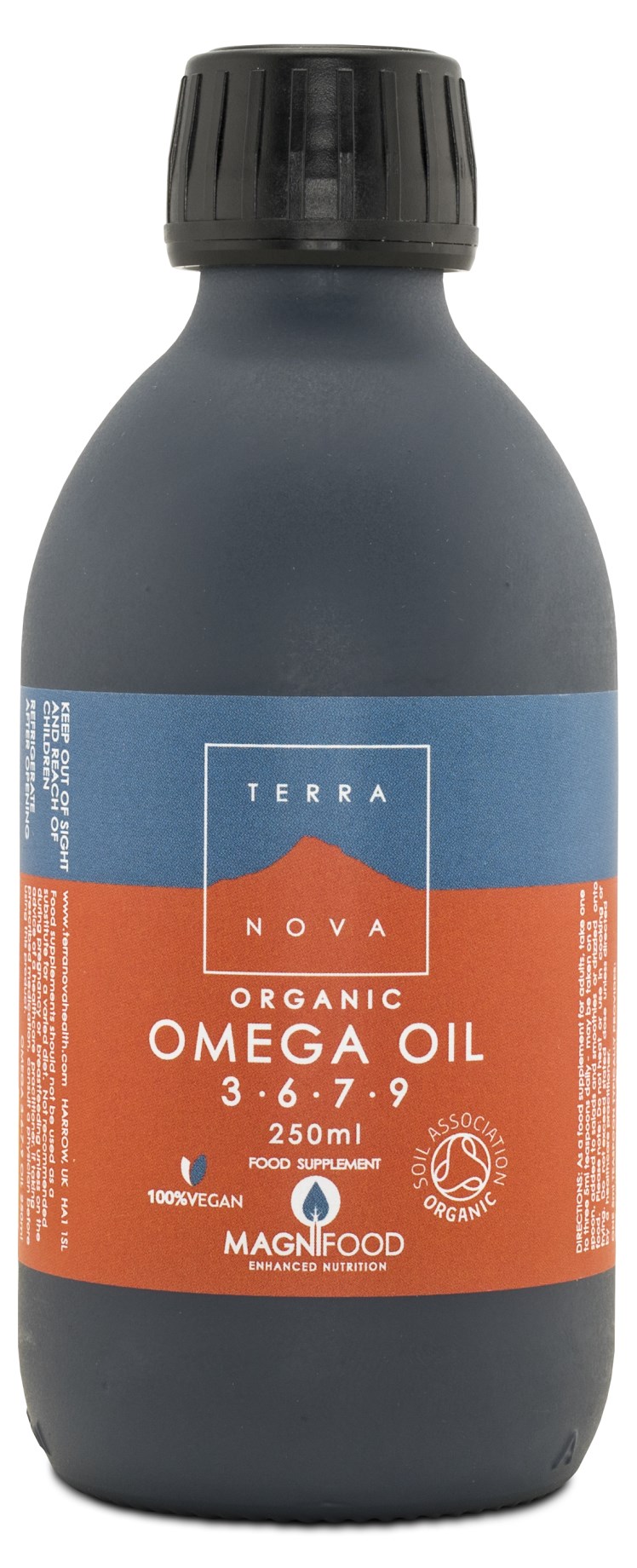 Terranova 100 % Organic Omega 3-6-7-9 Oil on luomua omega-öljy kasvikunnasta, mikä tarkoittaa, että se on puhdas, koska se tulee ravintoketjun alimmasta kerroksesta. Öljy sisältää muun muassa luomu pellavansiemenöljyä, joka on erityisen rikas omega-3-rasvahappoja ja luomu tyrniöljyä, joka sisältää omega-7-rasvahappoa, josta on tullut erittäin suosittu terveys- ja kauneustuotteissa. Terranova 100 % Organic Omega 3-6-7-9 Oil on täydellinen sinulle, joka olet vegaani tai haluat yhdistelmän kasviperäisiä rasvahappoja.