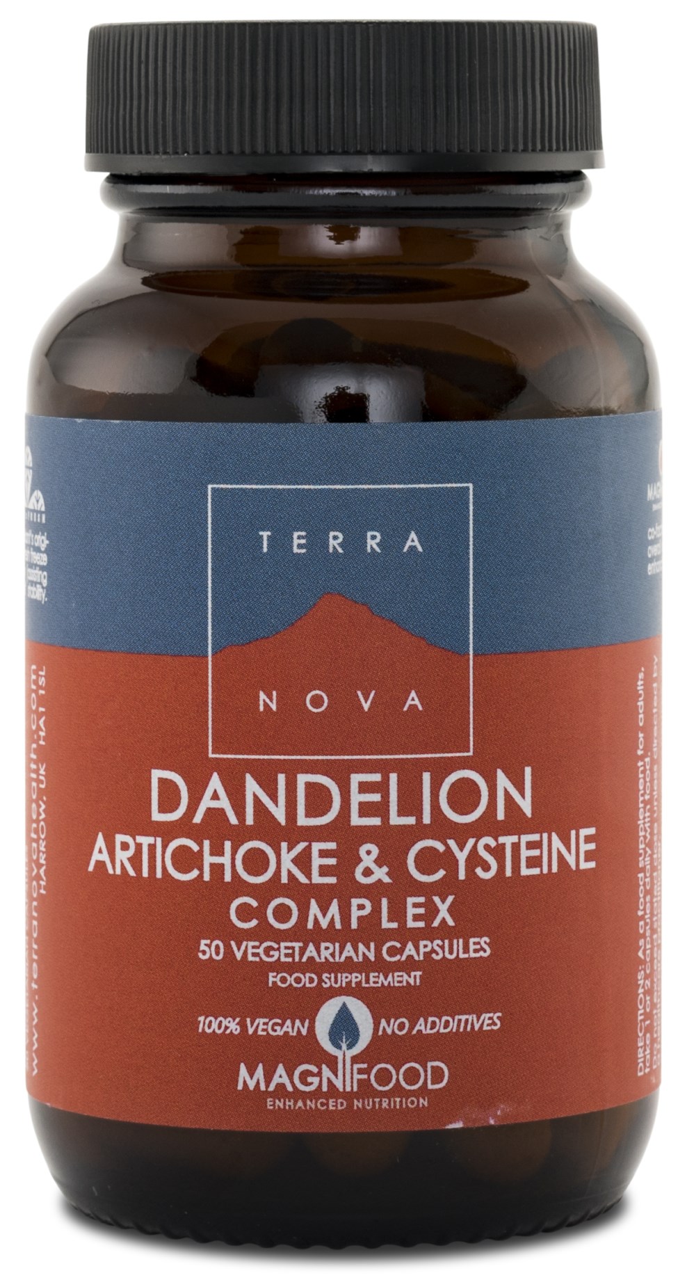 Terranova Voikukka-, Artisokka- ja Kysteiini-kompleksi on luontainen ravintolisä, joka sisältää ainutlaatuisen yhdistelmän voikukkaa, artisokkaa ja kysteiiniä. Voikukka on yrtti, joka luonnostaan sisältää katkeraineita ja mineraaleja, ja sen uskotaan vaikuttavan positiivisesti ruoansulatukseen, mikä pätee myös artisokkaan. L-kysteiini on rikkipitoinen aminohappo, jota keho valmistaa myös itse ja jota löytyy luontaisesti hiuksista, ihosta ja kynsistä. Terranova Dandelion, Artichoke & Cysteine Complex sisältää myös kurkumaa, vihreää teetä, lehtikaalia, ohranorasta ja stabiloitua riisinleseitä.
