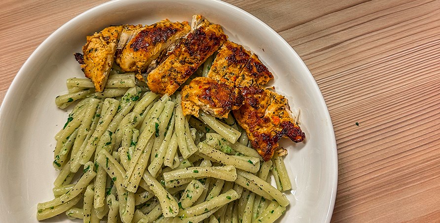 Ainekset: Täysjyväpasta, tomaattimurska, valkosipuli, oliiviöljy, tuore basilika ja hunaja-marinoitu kana.