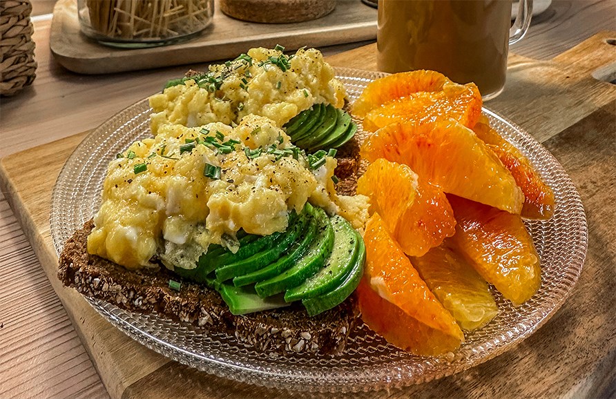 Tee näin: Sekoita munat kulhossa, paista pannulla. Täytä munakas avokadoviipaleilla, tomaatilla ja murustetulla fetalla. Mausta suolalla ja pippurilla.
