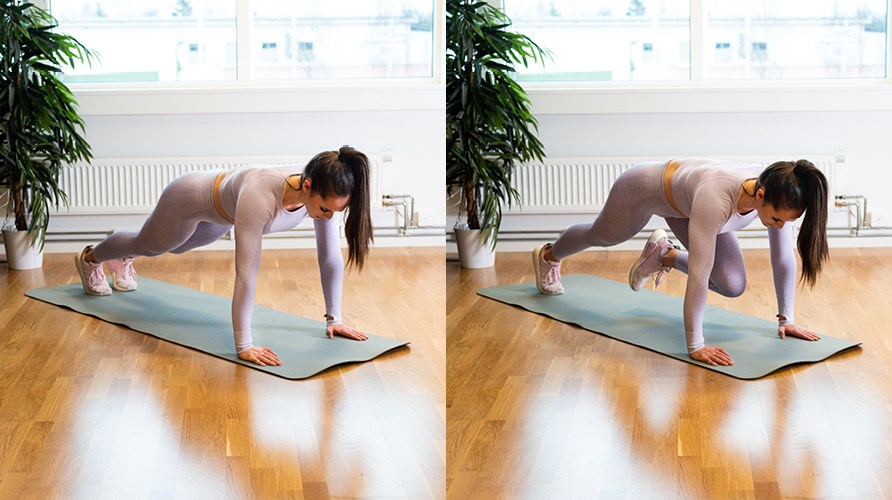 Mountain climbers- Hyvä harjoitus, jolla saadaan syke nousemaan ja samalla vatsalihakset treenattua. Asetu lankkuasentoon suorilla käsillä. Varmista, että kädet ovat suoraan hartioidesi alla. Nosta sitten vuorotellen oikea ja vasen polvi rintaasi kohti korkealla tempolla, kuin "juoksisit" paikallasi. Muista pitää peppu ja selkä suorana, jotta et rasita itseäsi väärin.