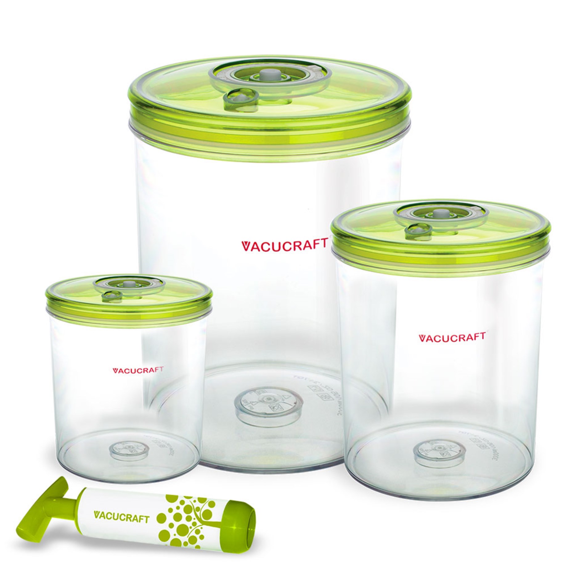 Säilytä ruoka tuoreena pidempään VacuCraftin avulla! Vacucraft Set 3 Säiliöt sisältävät kolme säiliötä, jotka mahtuvat yhdelle, kahdelle ja kolmelle litralla elintarvikkeita ja tuoreita raaka-aineita. Tyhjiötekniikan ansiosta poistetaan ilmaa, joka voi aiheuttaa bakteerien kasvua, mikä pidentää elintarvikkeiden säilyvyyttä jopa viisi kertaa pidempään kuin perinteiset säilytysmenetelmät. Täydellinen eväille, jäännöksille ja tuoreille raaka-aineille. Esimerkiksi hedelmät ja vihannekset pysyvät tuoreina ja juomat kuten mehut ja smoothiet säilyttävät makunsa ja ravinteensa pidempään. Valmistettu BPA-vapaasta, hajua kestävästä ja kestävästä Eastman Tritan -muovista, jossa on älykäs päivämäärän osoitin kannessa helpottamaan yleiskatsausta. Säilytä ruokaa paremmin, ja säästä sekä rahaa että resursseja!