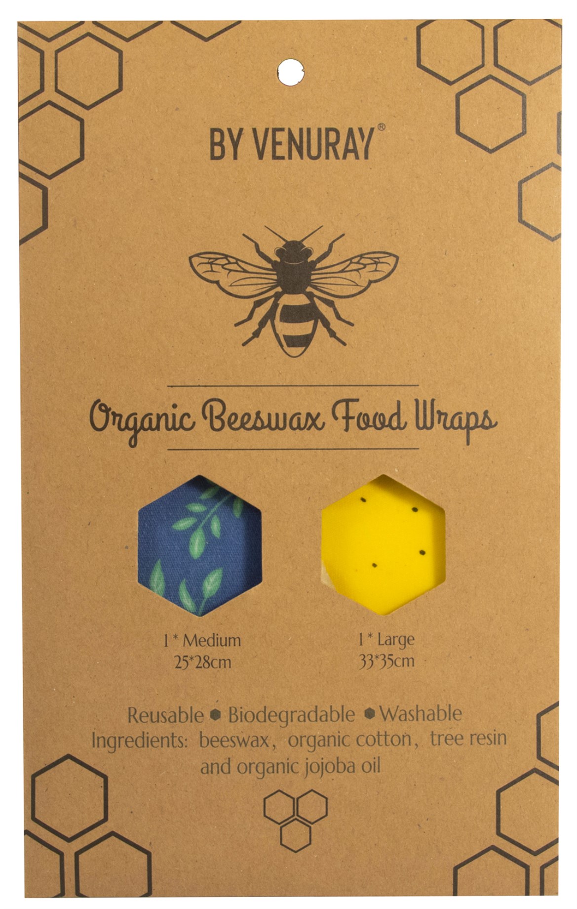 Venuray Mehiläisvahakangas on 2-pakkaus mehiläisvahakankaita ruoan säilytykseen. Kankaat on valmistettu mehiläisvahasta, luomupuuvillasta, puuhartsista ja jojobaöljystä. Ne pitävät ruoan tuoreena pitkään ja ne on lisäksi helppo pestä käyttökertojen välissä, mikä tekee niistä erittäin kestävän vaihtoehdon esimerkiksi muovikelmulle. Täysin vapaat BPA:sta, PVC:stä ja muista haitallisista kemikaaleista sekä 100 % biologisesti hajoavia.