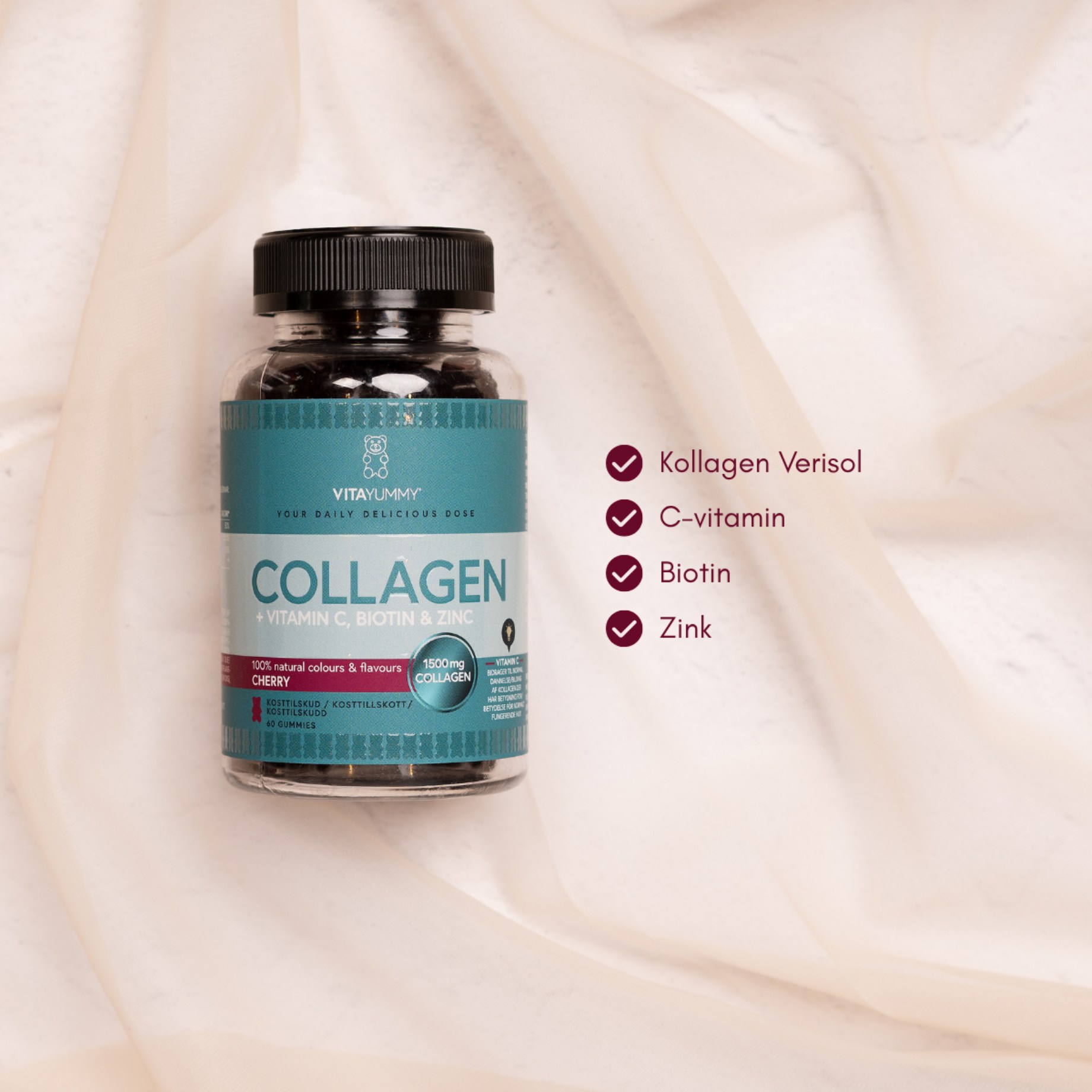 VitaYummy Collagen -kollageeninallet tekevät kollageenin saamisesta helppoa joka päivä, sillä ne maistuvat niin hyviltä, ettet unohda ottaa niitä! VitaYummy Collagen sisältää 1500 mg hydrolysoitua Verisol®-kollageenia, C-vitamiinia, joka edistää kollageenin normaalia muodostumista, sekä biotiinia ja sinkkiä, jotka auttavat ylläpitämään ihon normaalia kuntoa.