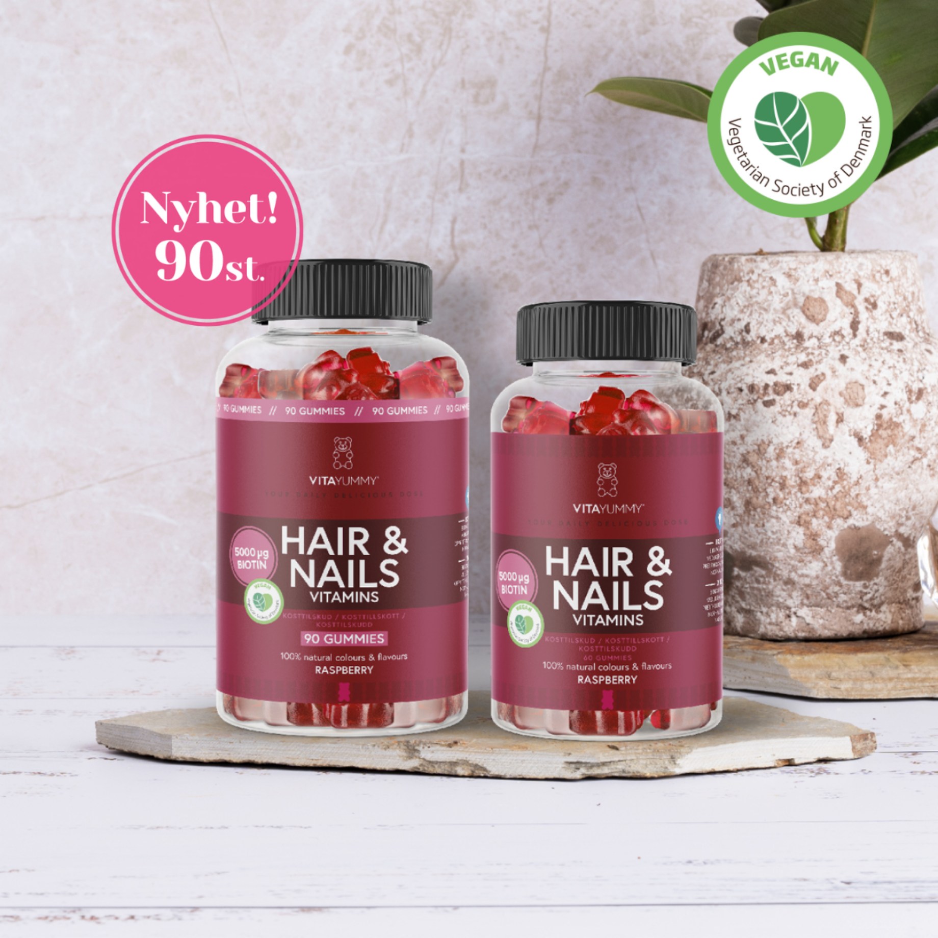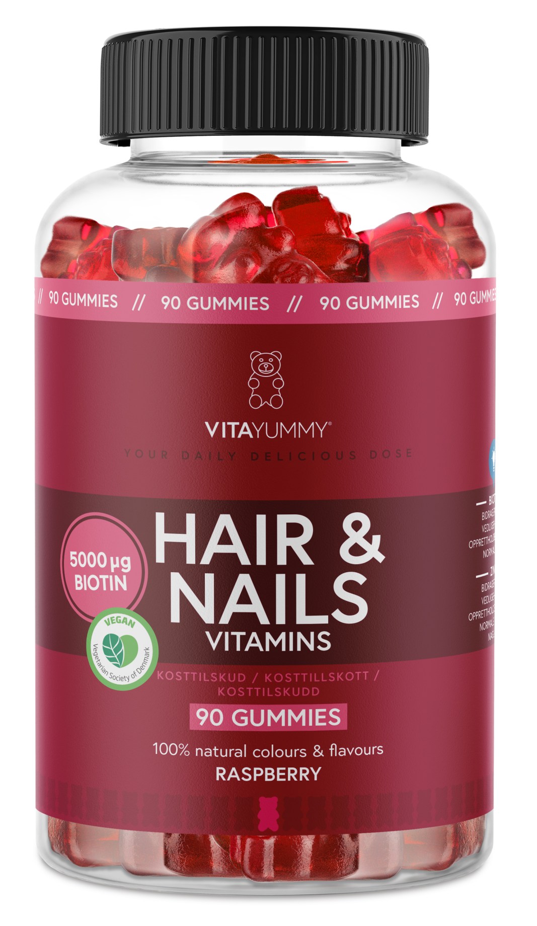 VitaYummy Hair & Nails gummies-nallet, jotka sisältävät vitamiineja ja kivennäisaineita. Jokainen nalle sisältää A-, B-, C-, D- ja E-vitamiineja sekä kivennäisaineista sinkkiä, seleeniä ja jodia. Biotiini (B7-vitamiini) ja sinkki edistävät hiusten ja kynsien pysymistä normaaleina, ja seleeni auttaa suojaamaan soluja hapettumisstressiltä. VitaYummy Hair & Nails ei sisällä keinotekoisia väri- tai makuaineita ja on täysin vegaaninen.