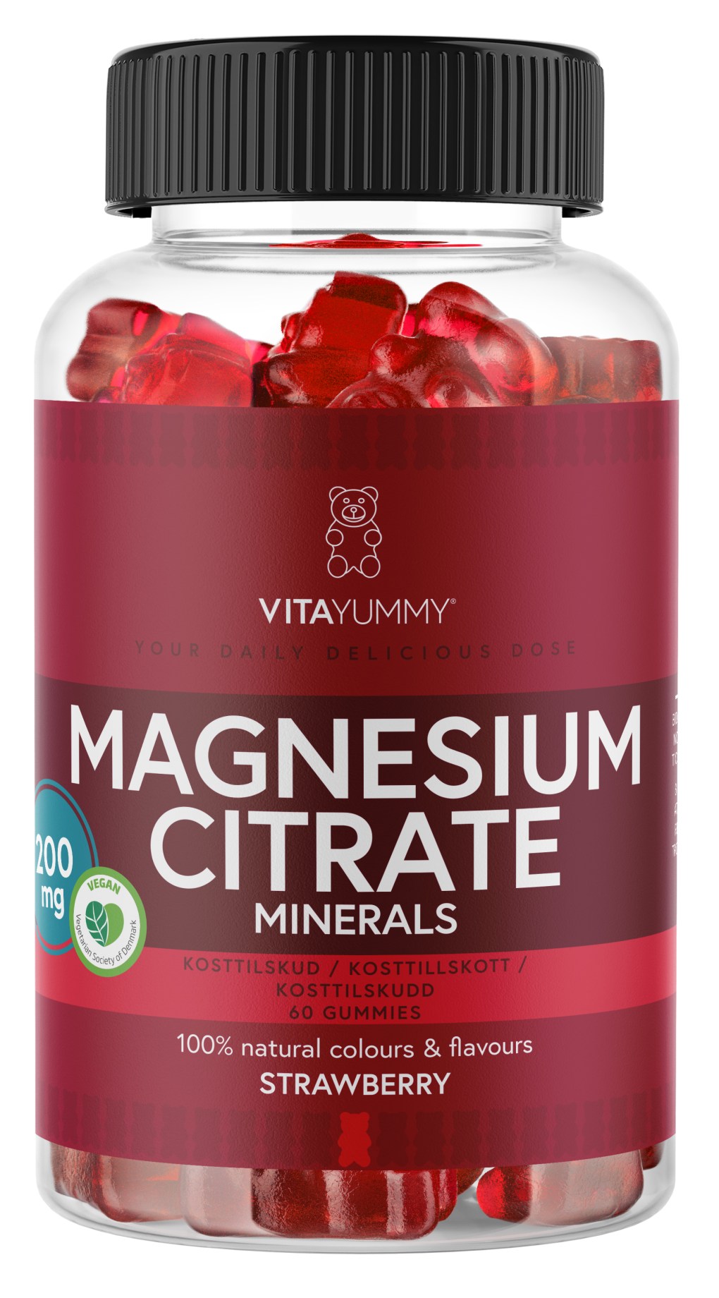 VitaYummy Magnesium Citrate -gummies ovat nallen muotoisia ja saatavilla herkullisen sitruunan ja makea mansikan makuisena. Magnesium on elintärkeä kivennäisaine, jolla on useita tehtäviä elimistössä. Se edistää muun muassa normaalia psykologista toimintaa, hermoston ja lihasten normaalia toimintaa sekä tukee hampaiden ja luuston pysymistä normaaleina. Lisäksi magnesium auttaa vähentämään väsymystä ja uupumusta. VitaYummy Magnesium Citrate -gummies ovat vegaanisia eivätkä sisällä makeutusaineita tai keinotekoisia maku- ja väriaineita.