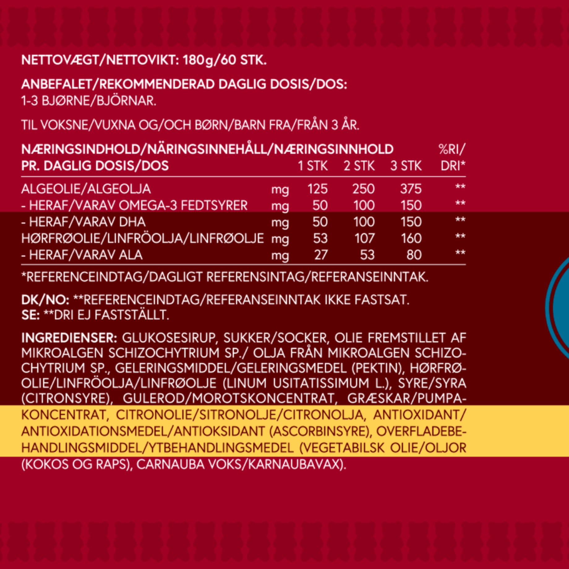 VitaYummy Omega 3 on omega-3-valmiste, joka sopii sekä lapsille että aikuisille. Se sisältää sekä DHA:ta että ALA:ta ja on täysin vegaaninen, sillä aktiiviset rasvahapot ovat peräisin levistä ja pellavansiemenistä. DHA edistää aivojen normaalia toimintaa ja näön pysymistä normaalina. ALA on elimistössä luontaisesti esiintyvä rasvahappo. VitaYummy Omega 3 on erinomainen kasvipohjainen vaihtoehto perinteiselle kalaöljylle – täysin ilman keinotekoisia värejä ja makuja. Luonnollinen väri tulee porkkanasta ja kurpitsasta.